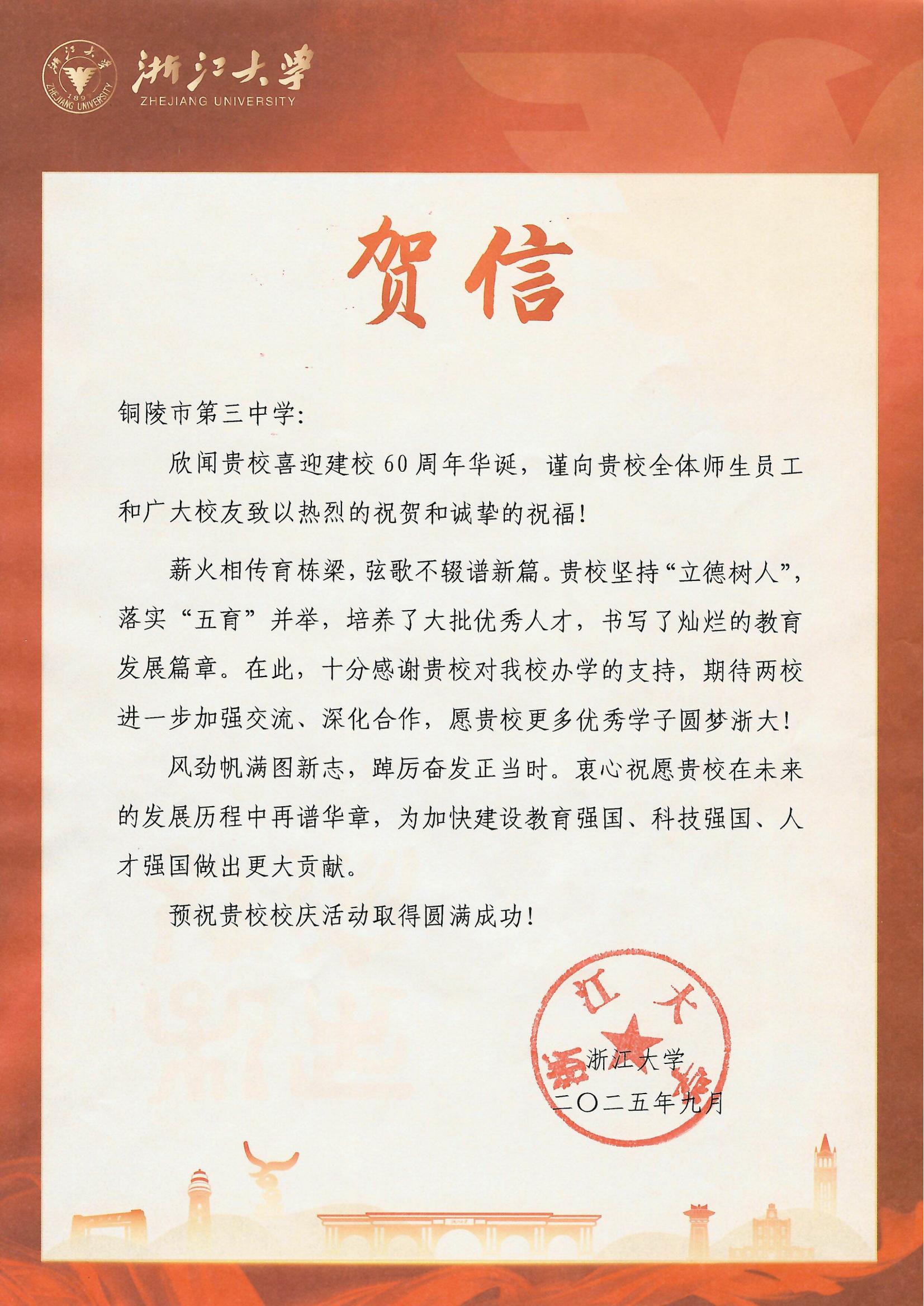 浙江大学向我校发来贺信