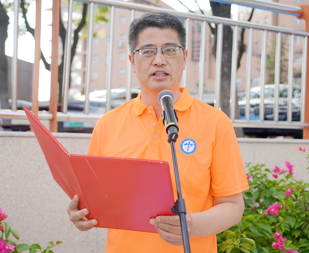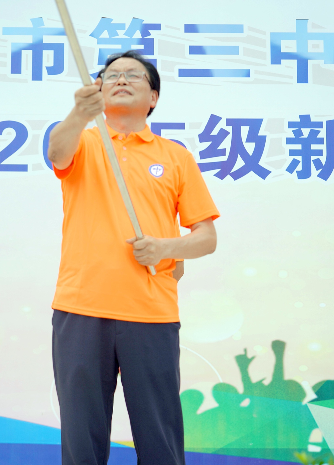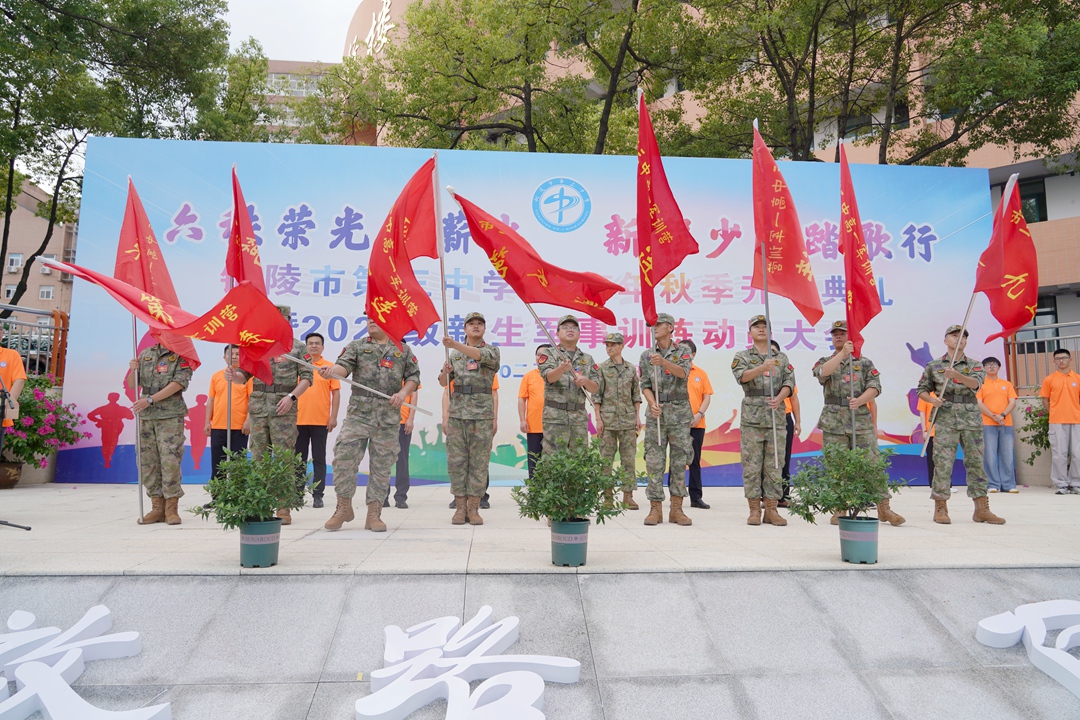 保卫科刘坚老师宣读了此次高一新生的军事训练工作计划;校党委委员、副校长钱军为军事训练营授营旗,全体领导为各班级授旗。