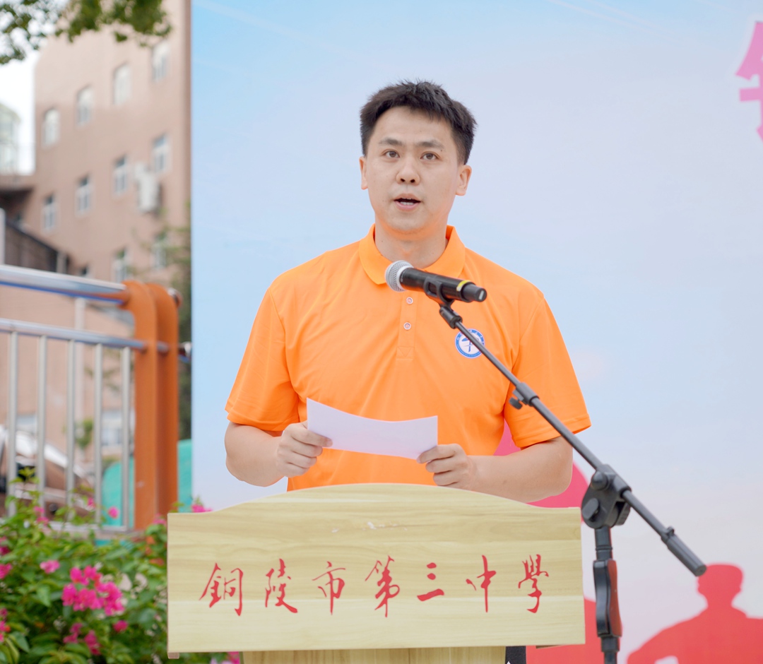 校党委副书记、校长张尤俊致辞,他代表学校向鼎力支持我校军训工作的铜陵市郊区人民武装部的领导和承担本次军训任务的教官团队表示衷心感谢。 他指出,军训是磨砺意志的砥砺石,是纪律养成的实践课,更是是凝聚团队的训练营。他要求,全体高一新生要尊重教官,虚心学习;要顽强拼搏,磨练意志;要科学参训,安全第一;要团结友爱,共同进步。他希望全体高一新生以饱满的热情、昂扬的斗志和坚定的行动,投入这场成长之旅。