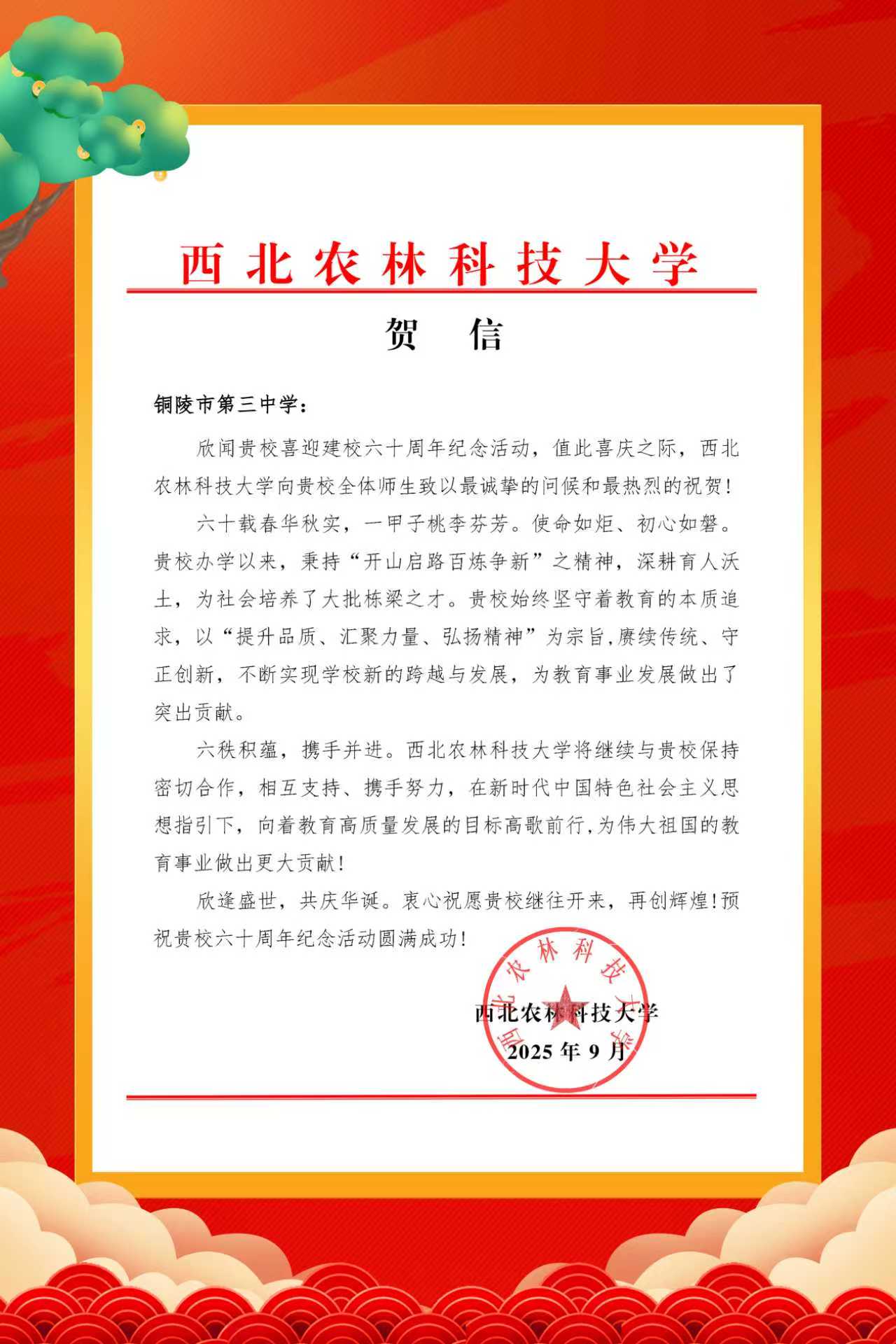 西北农林科技大学向我校发来贺信