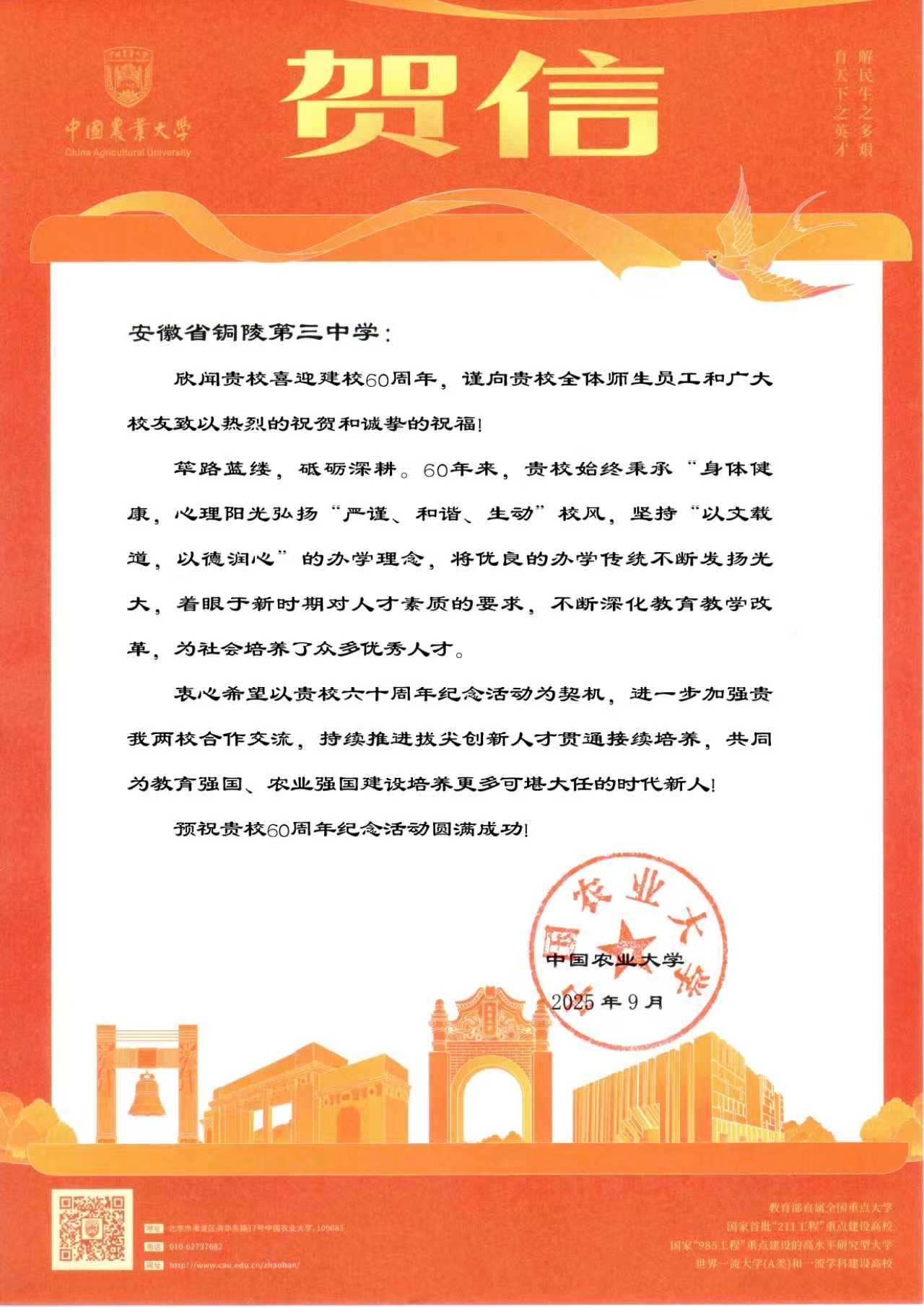 中国农业大学向我校发来贺信