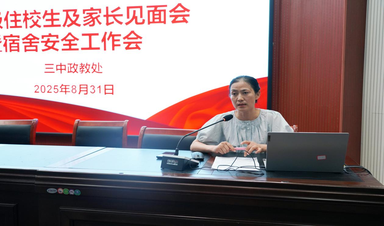 为进一步加强家校沟通,帮助新进住校生更好地适应校园集体生活,共同筑牢校园安全防线,2025年8月31日下午,我校政教处在多功能厅召开了新进住校生及家长见面会暨宿舍安全工作会议。政教处马红老师、全体宿管老师、本届新进住校生及其家长共同参加了此次会议。
