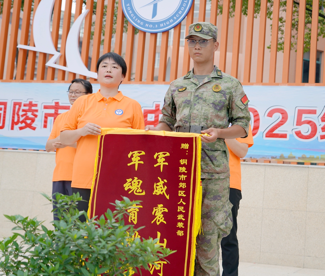 党委委员、副校长管婷婷同志为承担本次军训任务的铜陵市郊区人民武装部授旗。全体承训教官勇于奉献、担当重任,以严谨的标准组织实施训练,出色完成各项军训任务,展现出过硬的军事素养和追求卓越的奋斗精神。