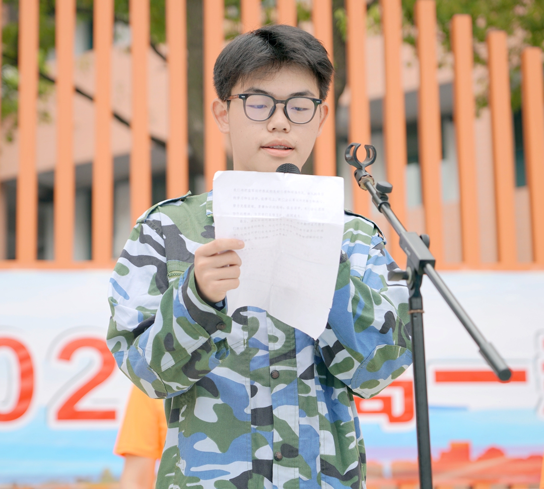 学生代表112 班余黉博分享了军训期间汗水与坚持交织的成长历程,由衷感谢教官的严格指导与老师们的暖心陪伴,也感念同学间的互助与团结。他倡议全体新生将军训中所收获的勇气、毅力和责任感延续至今后的学习与生活,严于律己、勤学笃行,真正将军人精神融入日常,不负青春、不负时代。