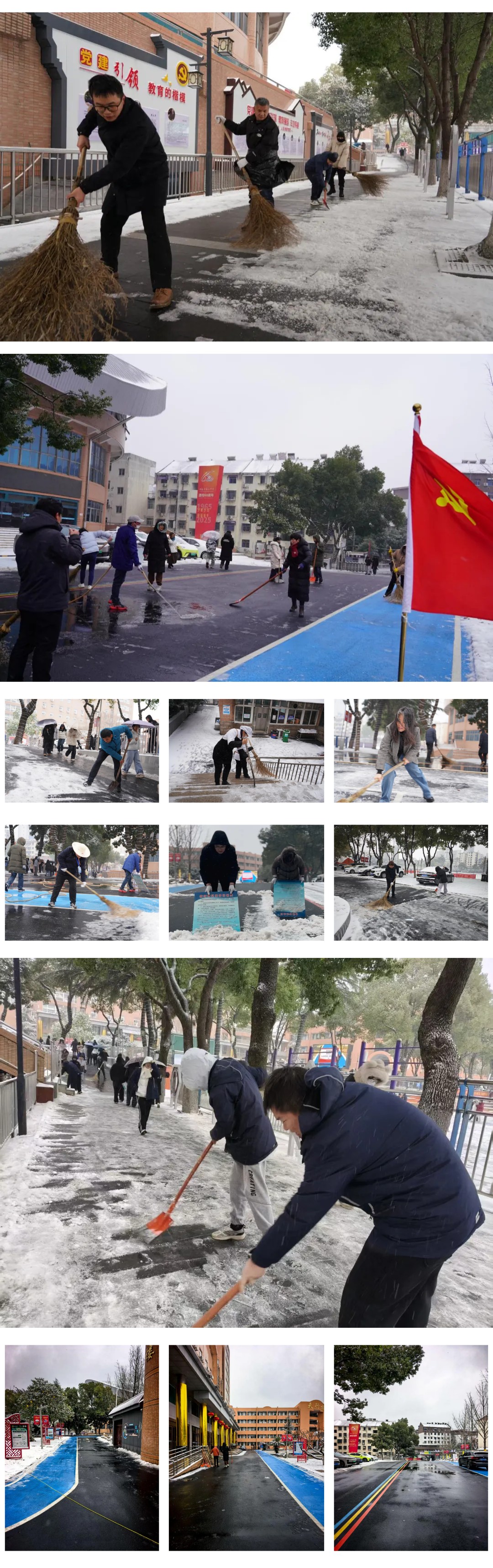一夜寒风起,琼花覆校园。1月20日清晨,一场不期而遇的冬雪悄然落满学校的角角落落。银装素裹虽美,却也给师生出行带来了诸多不便。 为保障校园道路畅通、师生出行安全,学校党委及时组织全体行政人员、党员教师进行扫雪除冰,班主任、教师及部分学生积极响应,他们手持铁锹、扫帚,奔赴学校餐厅、教学楼周边及主干道等重点区域,展开了一场热火朝天的扫雪除冰行动,全力保障校园道路畅通与师生安全。