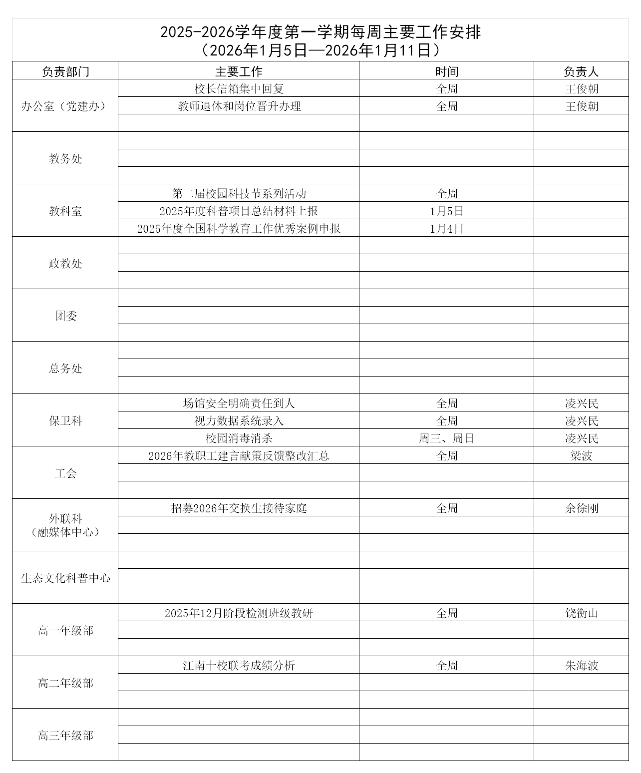 铜陵三中2026年秋季学期周工作安排(2026年1月5日-2026年1月11日)