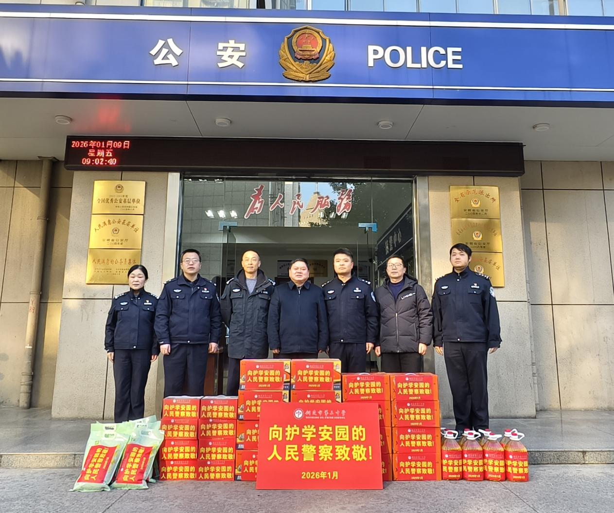 在第六个中国人民警察节即将到来之际(每年1月10日为中国人民警察节) ,2026年1月9日上午,铜陵市第三中学党委书记王合进带领学校相关处室负责人一行,先后前往铜陵市交警支队与市公安局长江路派出所开展走访慰问活动,向长期坚守一线、护航校园平安的全体民辅警送上节日祝福与慰问物资,共话警校鱼水深情,共筑安全防护屏障。
