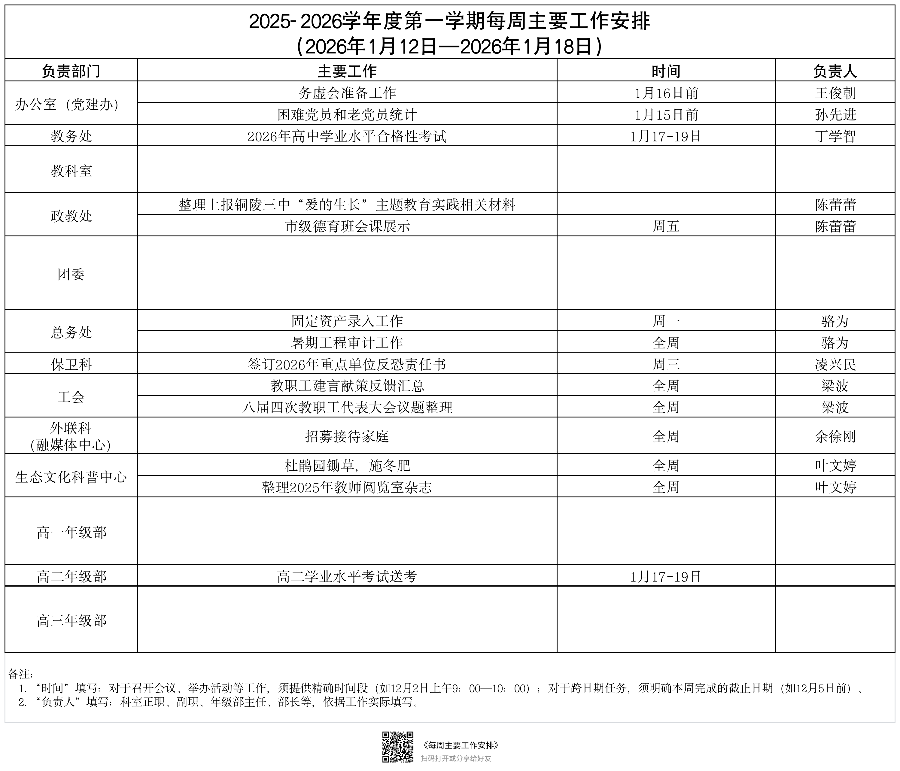 铜陵三中2026年秋季学期周工作安排(2026年1月12日-2026年1月18日)