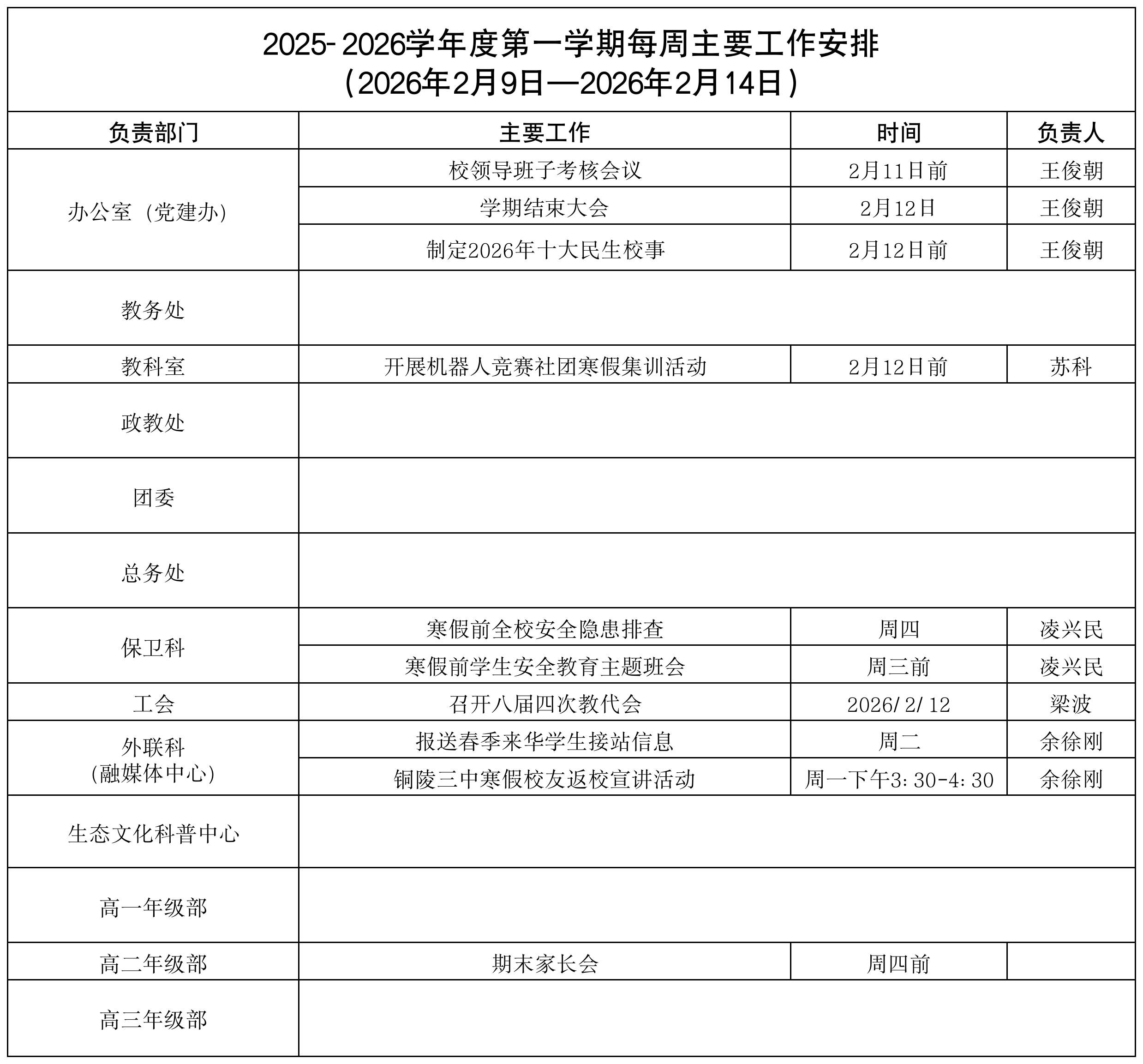 铜陵三中2026年秋季学期周工作安排(2026年2月9日-2026年2月14日)
