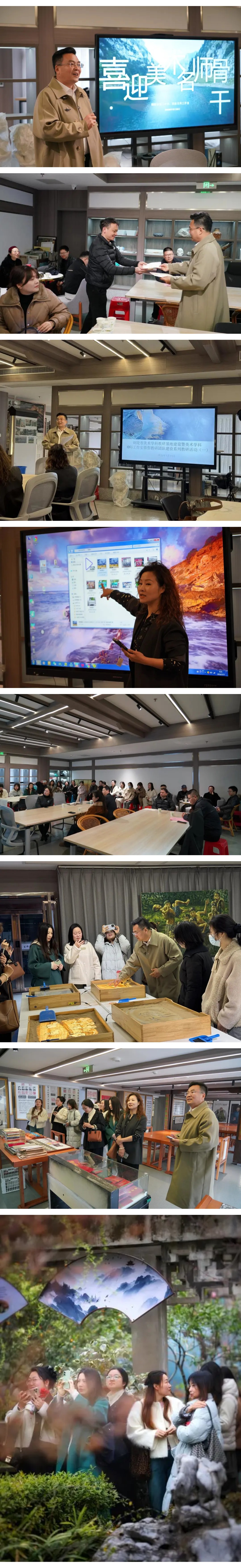 实地研学,涵养美育教研生态。依托铜陵三中教研基地校的美育资源优势,活动搭建沉浸式研学平台,推动校际美育资源共建共享,为微型教研团队积累实践经验。理论培训后,与会教师走进学校沙画教室、植物园、五松山文化碑廊、五松书院、黄百新书刻艺术馆等特色美育阵地,在融铸铜都文化的沙画作品中感受传统与现代的艺术交融,在自然生态与人文景观中体悟“生活即美育”的深刻内涵,在书香与艺术的交织中领略“以美育人、以文化人”的办学追求。教研基地校的特色美育实践,为各微型教研团队提供了可借鉴、可复制的教学实践范本,推动校际间美育经验互鉴、资源互通、教研互促,进一步丰富了铜陵美术教研的生态内涵。