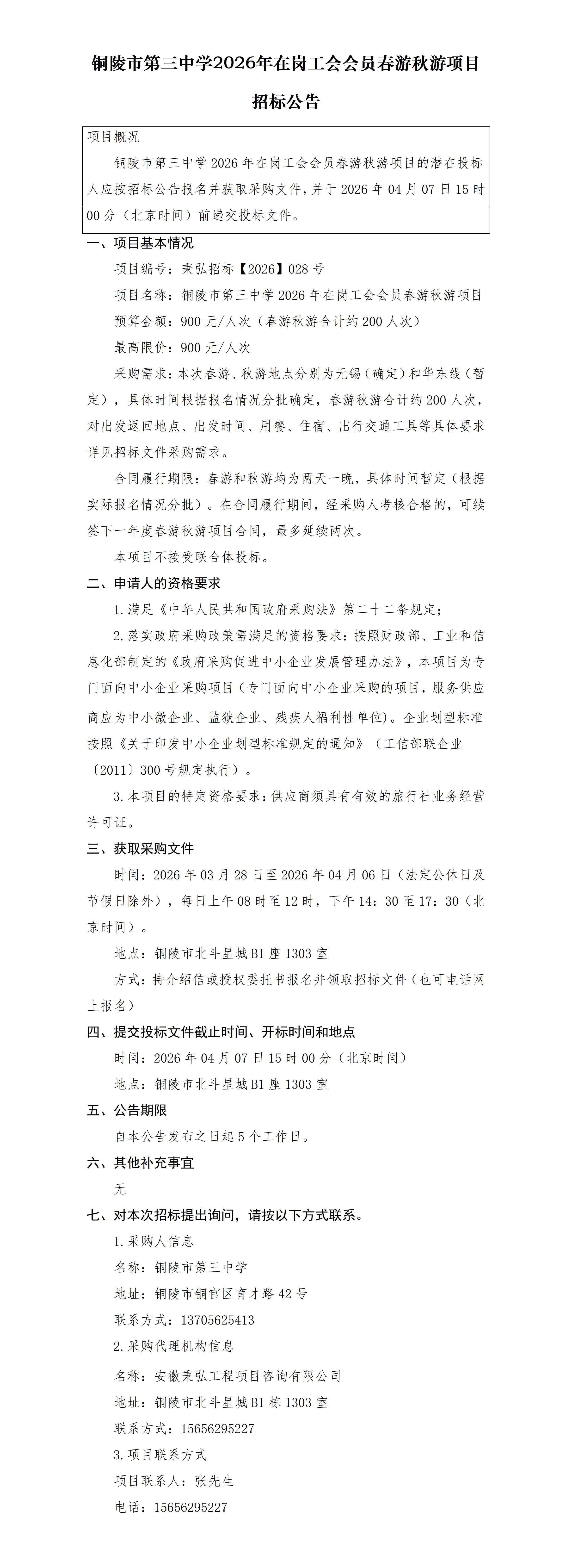 铜陵市第三中学2026年在岗工会会员春游秋游项目招标公告