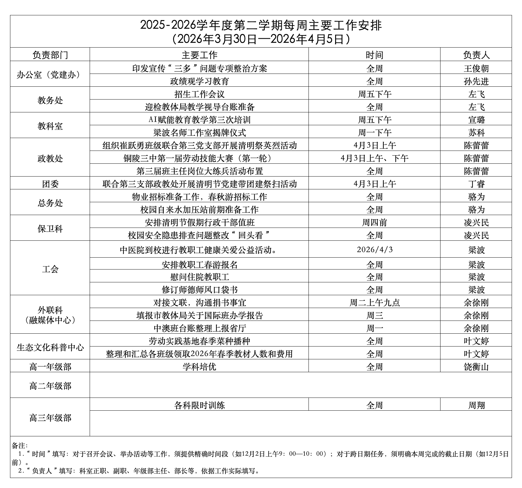铜陵三中2026年春季学期周工作安排(2026年3月30日-2026年4月5日)