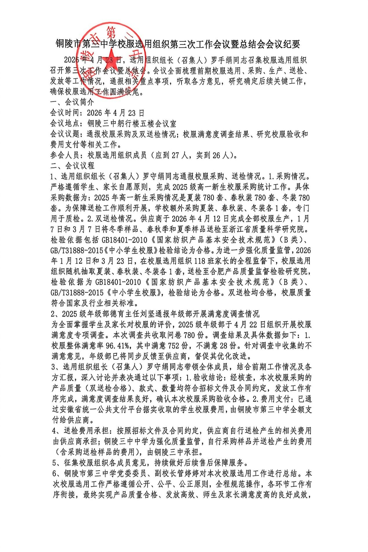 3、选用组织组长(召集人)罗守绢同志带领全体成员,结合前期工作情况及各方汇报,深入讨论并表决通过以下事项:1.验收结论:经核查,本次校服采购的产品质量(双送检合格)、款式、数量均符合招标文件及合同约定,发放工作有序完成,满意度调查结果良好,确认本次校服采购验收合格。2.费用支付:已通过安徽省统一公共支付平台据实收取的学生校服费用,由铜陵市第三中学全额支付给供应商。