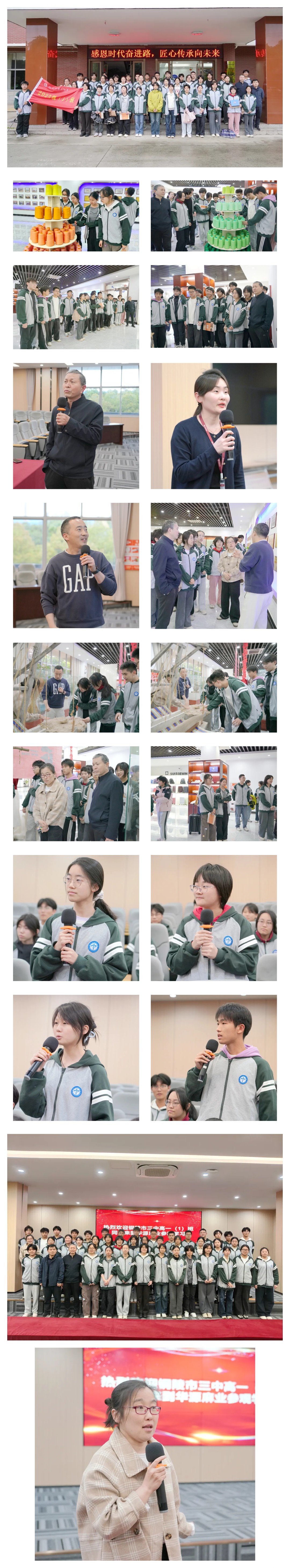 铜陵华源麻业始建于1958年,历经六十余年发展,已成长为中国亚麻纺织领军企业,是新中国工业发展、改革开放与高质量发展的生动缩影。在展厅,同学们聆听了企业负责人的详细介绍,全面了解企业发展历程,了解了企业从深耕本土到迈向国际市场,真切感受企业坚守初心、勇于创新的发展之路,深刻体会工匠精神与企业家情怀。在会场,历史老师冯定育立足课本知识,紧扣时代发展脉络,结合企业六十余年的发展历程,将华源麻业的发展变迁与新中国工业建设、改革开放、产业升级等历史节点深度串联,把企业发展史化作鲜活的历史实践课堂。