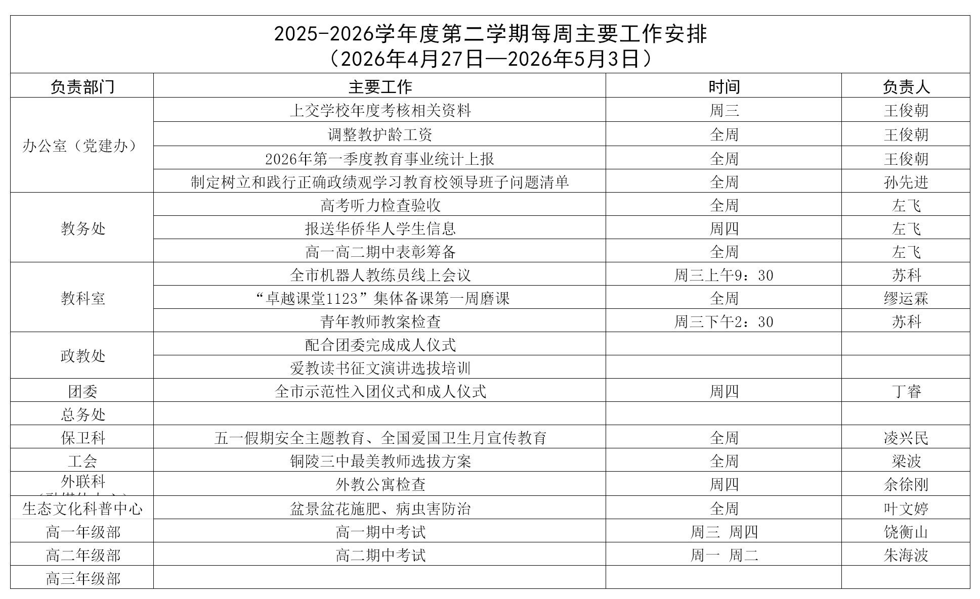 铜陵三中2026年春季学期周工作安排(2026年4月27日-5月3日)