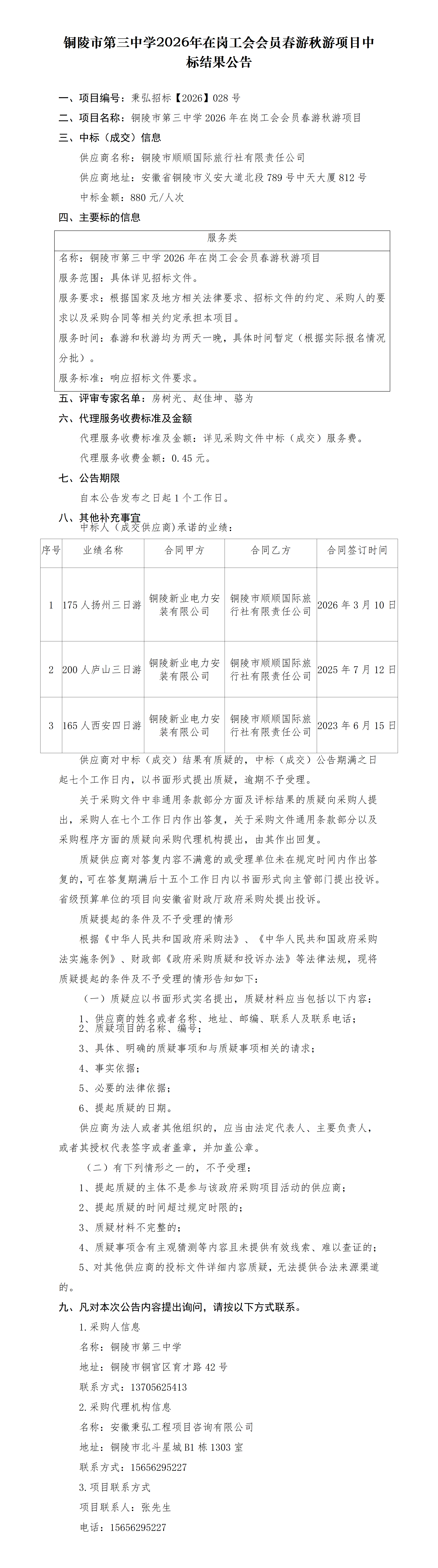 铜陵市第三中学2026年在岗工会会员春游秋游项目中标结果公告