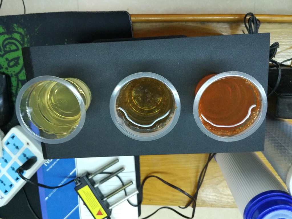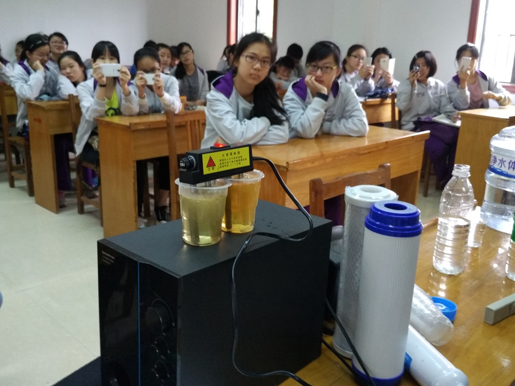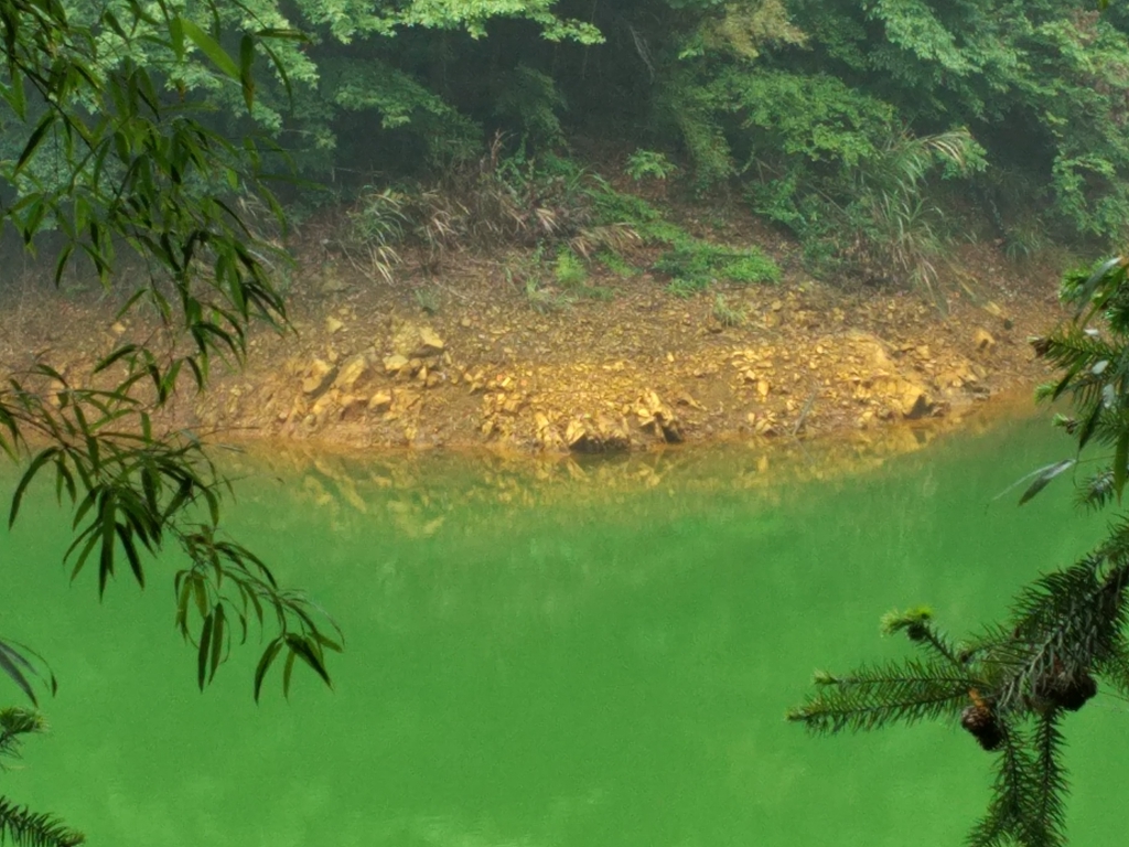 第二个水质监测点位于数公里处的另一库区。由于早期硫金矿的大规模开采,导致重金属、硫化物沉淀、溶解其中,水体颜色已发生明显异变。将两个库区采集的水样带回村部后,会议室里,坐无虚席,怀着迫不及待的心情,同学们目不转睛地观察着,经专业技术人员现场定量监测、电解试验,不同水质的对比差异一目了然,污染库区水体的硫化物和重金属含量之高令人震惊。