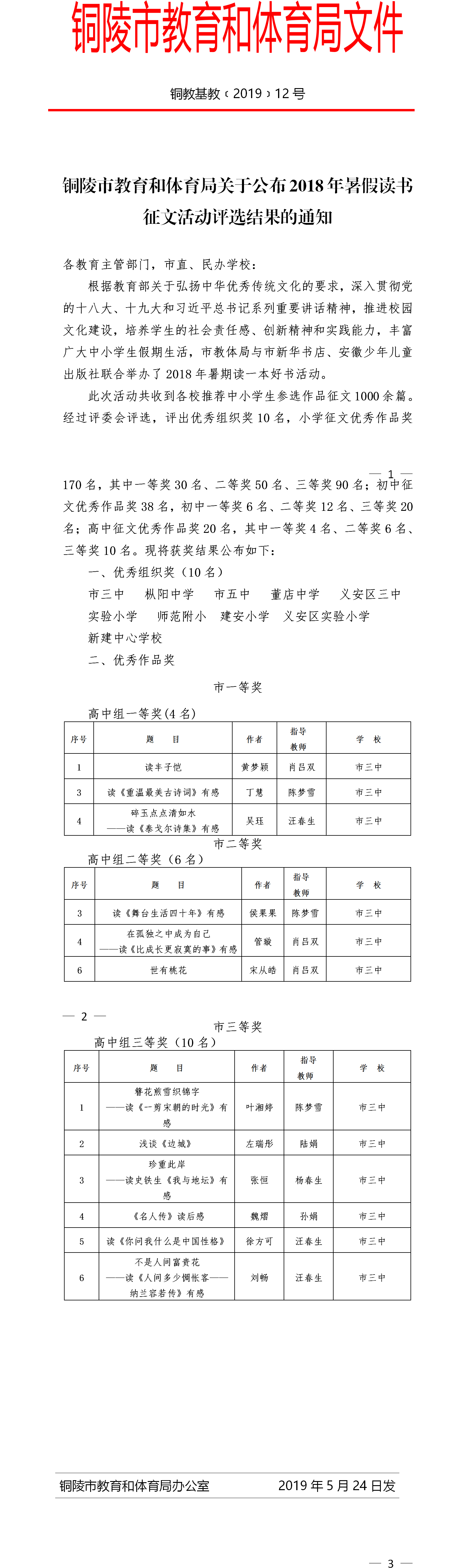 此次活动是根据教育部关于弘扬中华优秀传统文化的要求,深入贯彻党的十八大、十九大和习近平总书记系列重要讲话精神,推进校园文化建设,培养学生的社会责任感、创新精神和实践能力,丰富广大中小学生假期生活,市教体局与市新华书店、安徽少年儿童出版社联合举办的2018年暑期读一本好书活动。此次活动共收到各校推荐中小学生参选作品征文1000余篇。经过评委会评选,高中征文优秀作品奖20名,其中一等奖4名、二等奖6名、三等奖10名。