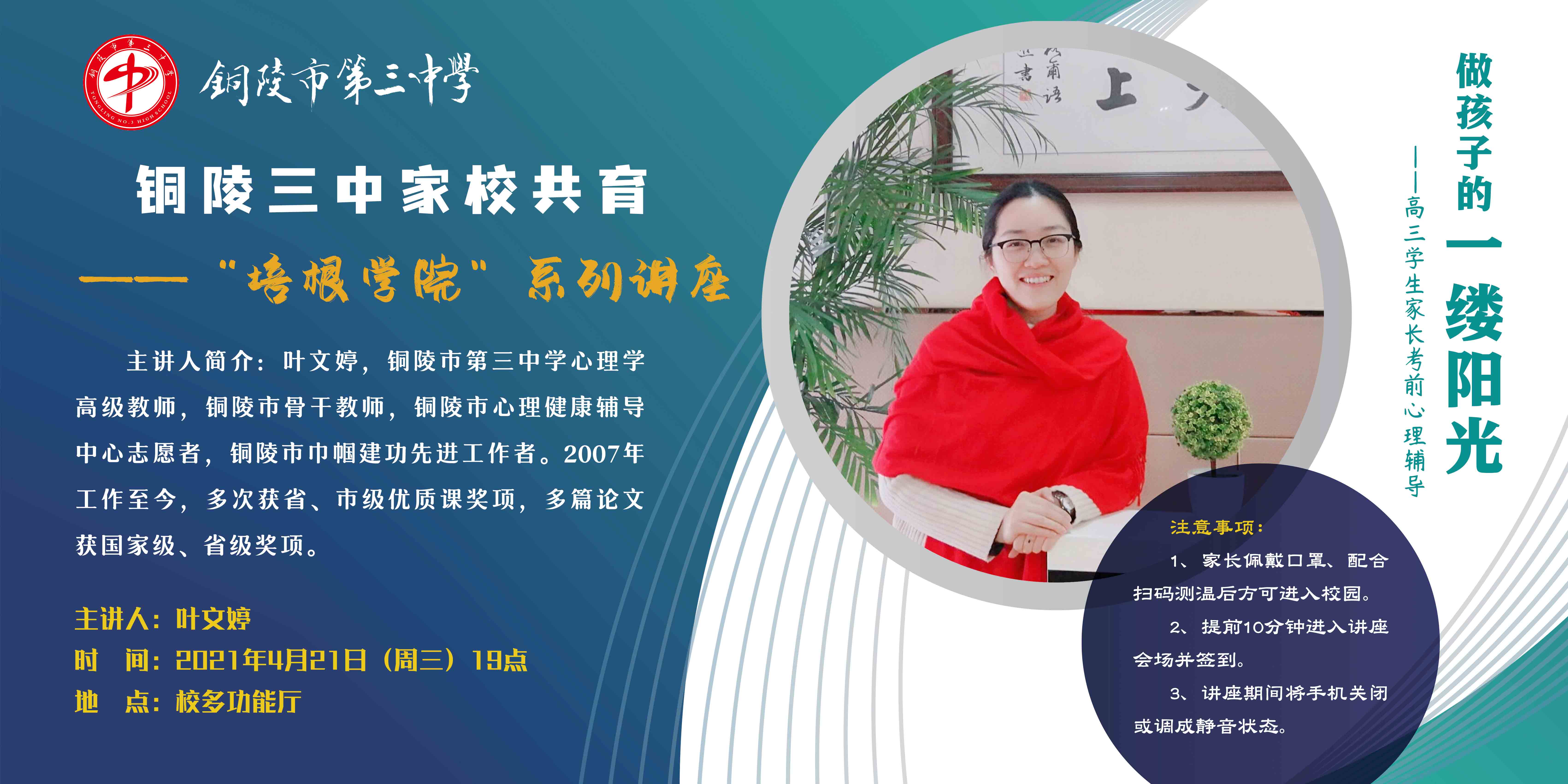 高考临近,学生及家长的心理压力日渐凸显。4月21日晚,我校心理学高级教师叶文婷老师在校多功能厅开展了一场别开生面的讲座,家校合力,做有温度的教育!