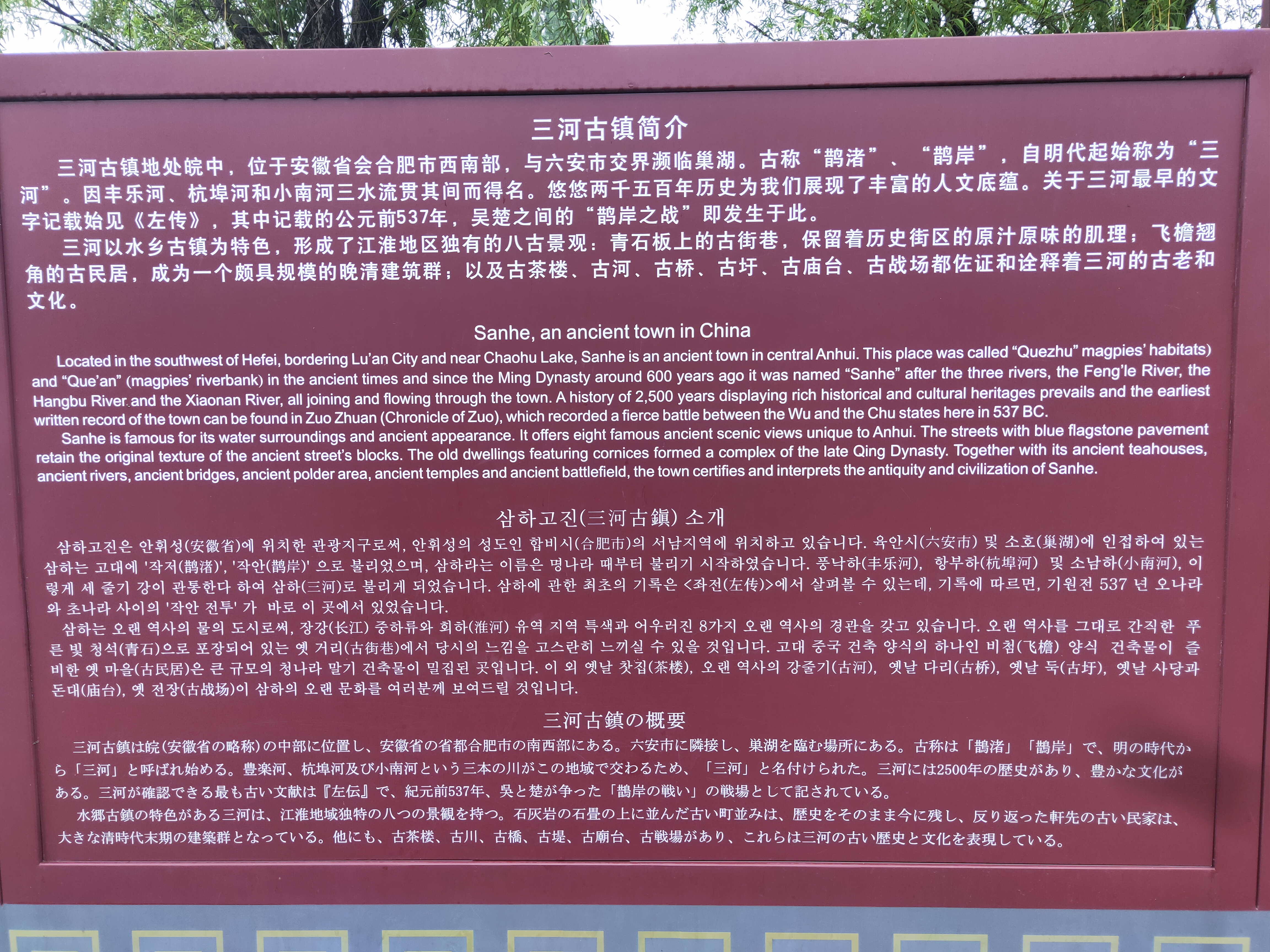 三河古镇景区系国家5A级旅游景区,地处合肥市肥西县境内,位于巢湖之滨,与庐江县、舒城县相邻,素有一步跨三县,三县闻鸡鸣之称。已有2500多年历史的三河镇因丰乐河、杭埠河、小南河三条河流贯其间而得名。