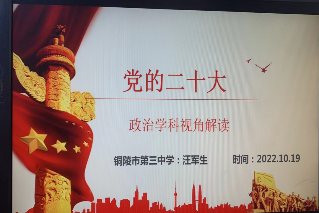 党员干部带头学,争做先学先悟“领头雁”。19日上午,思政组汪军生老师以《党的二十大——政治学科视角解读》为题,为党员干部上了一节生动的政治课。