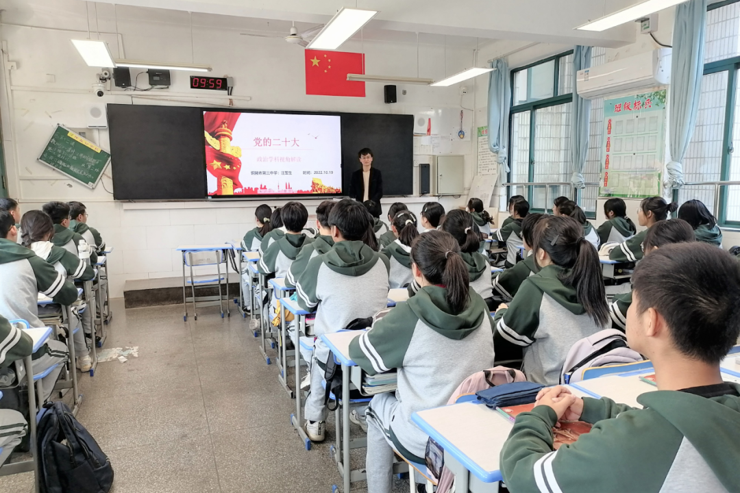课堂分别从报告的全文解读和党的二十大报告中的重要提法两个部分构成,结合政治学科,深入地学习了党的二十大精神。深刻理解、全面把握二十大工作报告中提出的重大理论观点、作出的各项工作要求,深刻领悟“两个确立”的决定性意义,进一步增强“四个意识”、坚定“四个自信”、做到“两个维护”,不忘初心、牢记使命,确保党领导下的人民教育事业始终沿着正确方向前进。