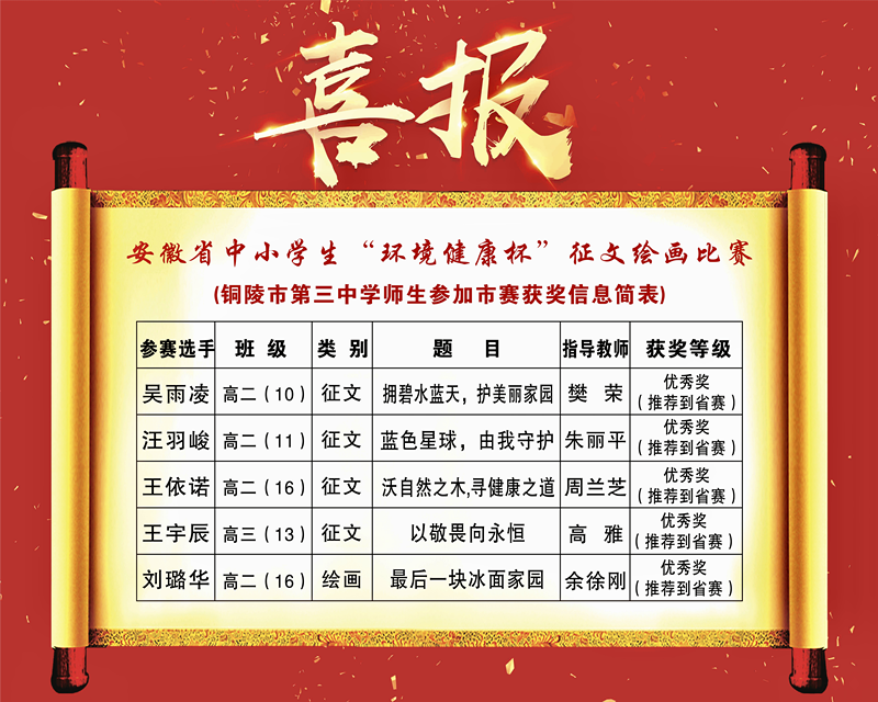为全面提高公众对气候变化与健康关系的认知度,推进实施《健康中国行动(2019-2030)》,提升中小学生参与应对气候变化相关活动的意愿,铜陵市疾控中心和铜陵市教体局联合开展“环境健康杯”征文绘画比赛,我校4名学生的征文作品和1名学生的绘画作品榜上有名,推送至省组委会。