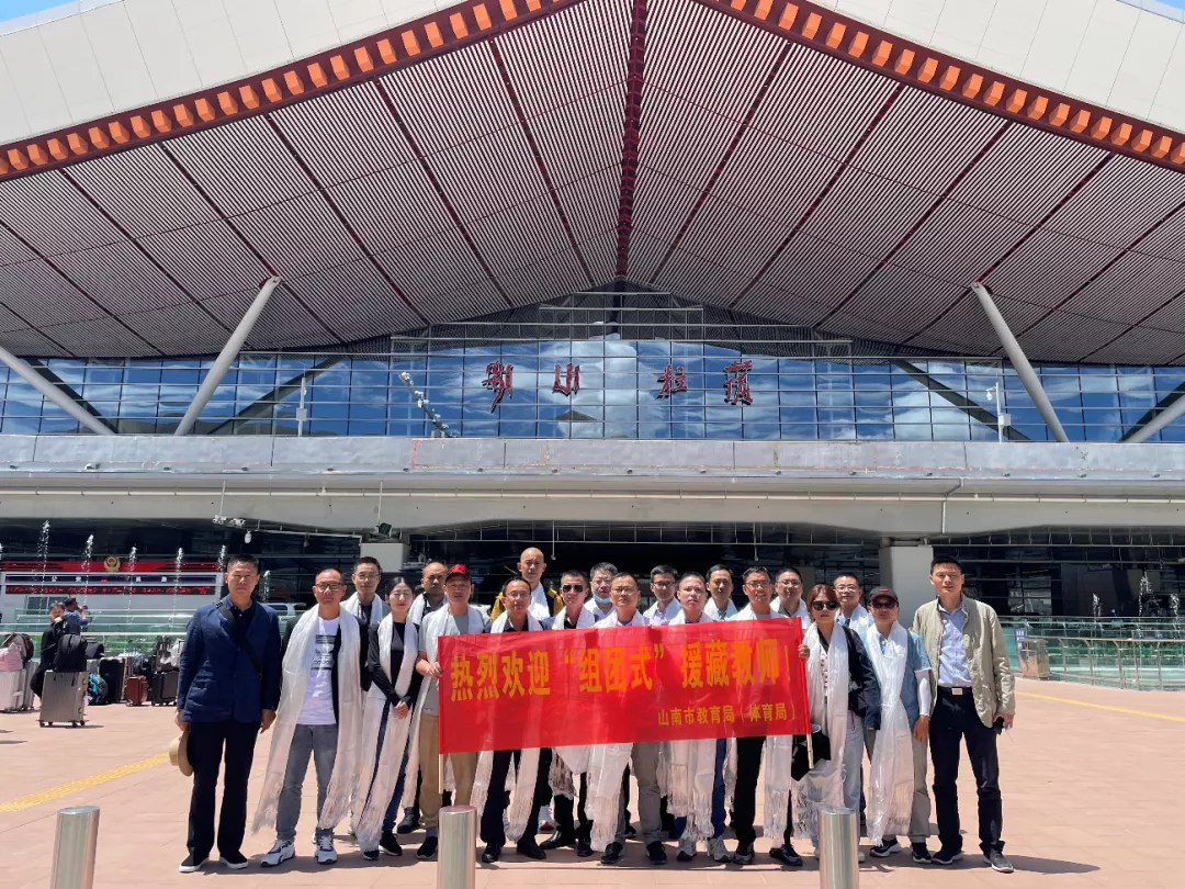 下午两点,飞机降落在贡嘎国际机场,第一次踏上雪域高原的土地,蓝得像幕布一样的天空,远处依稀可见的磅礴群山,都让我内心震撼无比。先行一步到这里的单强书记、蒋正飞局长和本地教育局领导在机场迎接我们,广场上的这张合影,是温暖、庄重的仪式感。