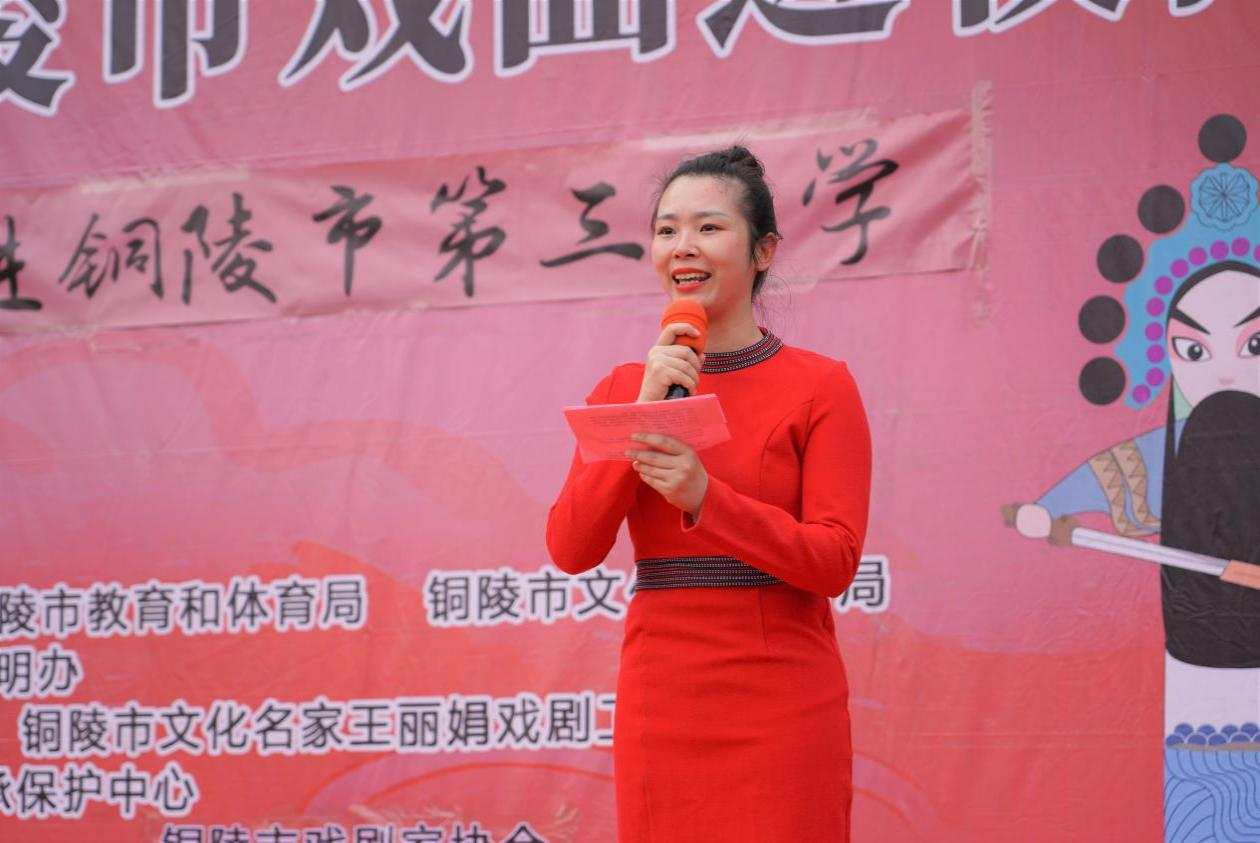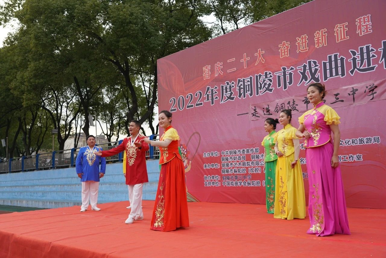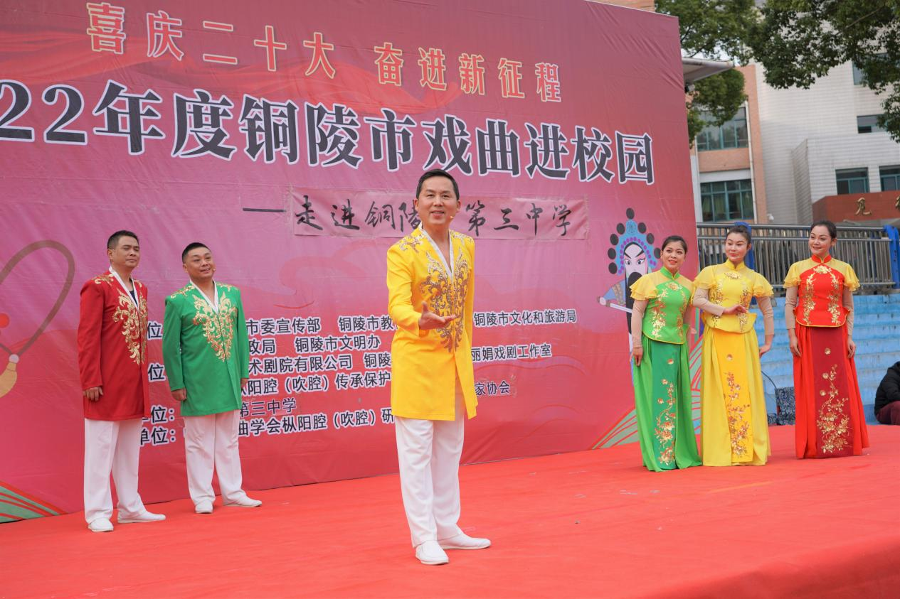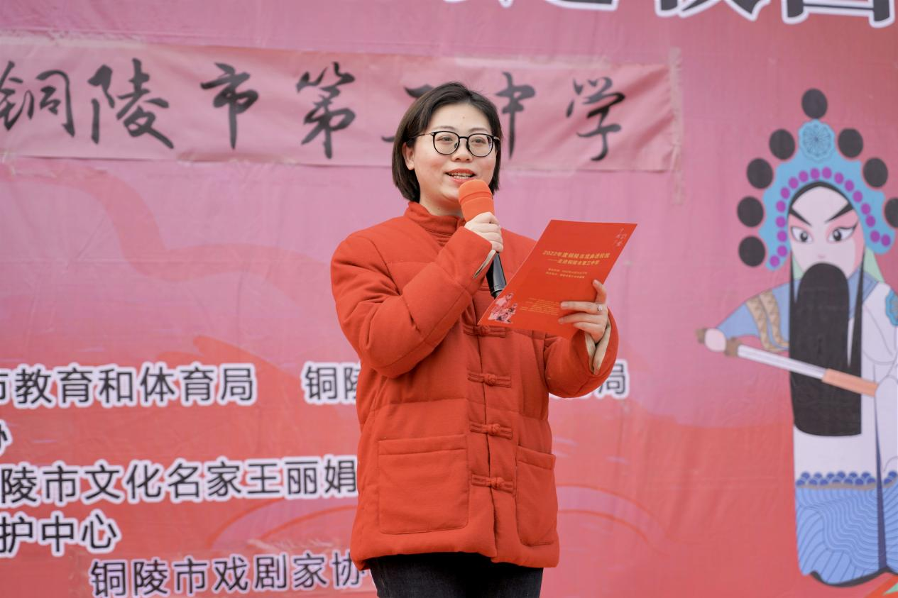 戏曲是中华文化的瑰宝,传承戏曲艺术关键在人,一代代戏曲人执着坚守、口传心授,创造了璀璨的中华戏曲文化,将这门古老的艺术薪火相传、源远流长。同学们,让我们一起弘扬中华优秀传统文化、传承戏曲艺术、创新校园文化、打造特色教育,书写铜陵文化教育事业的新篇章。