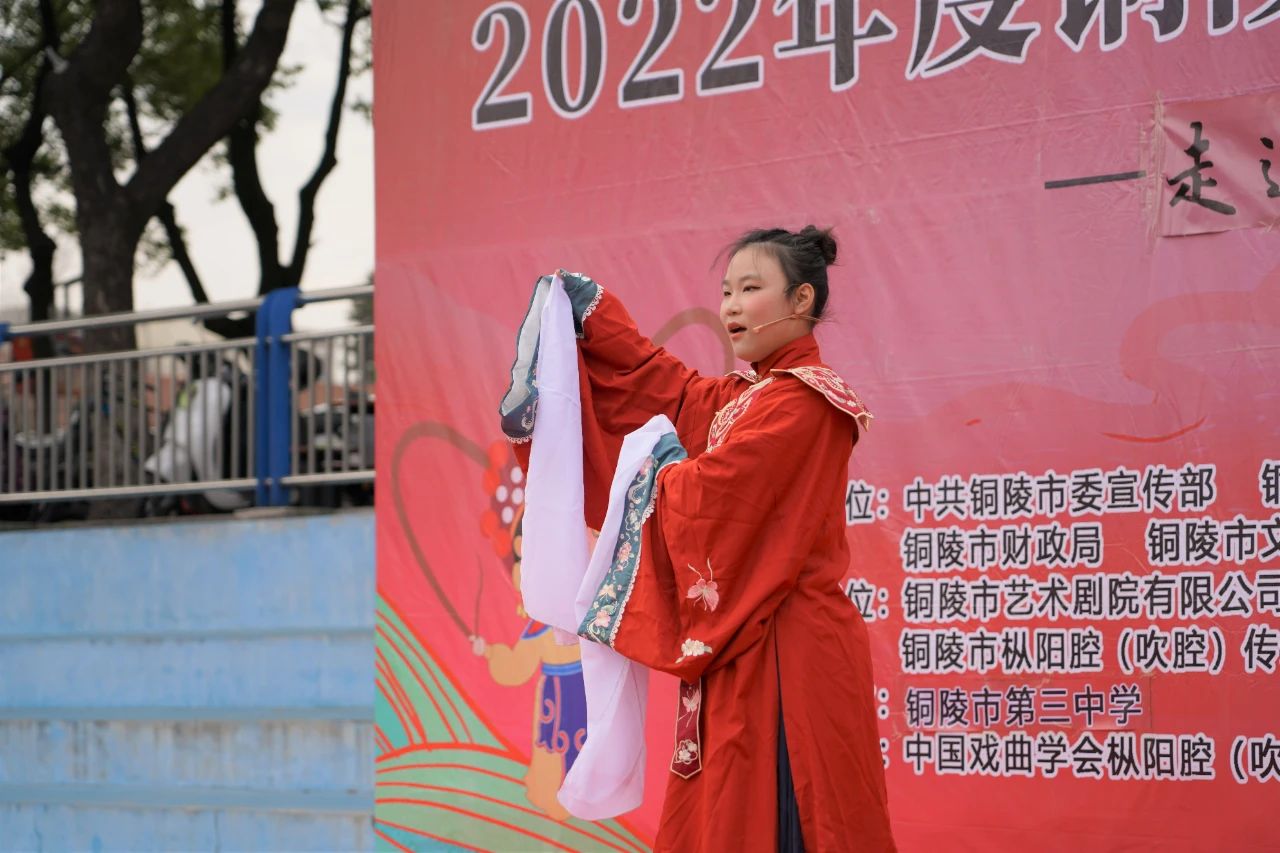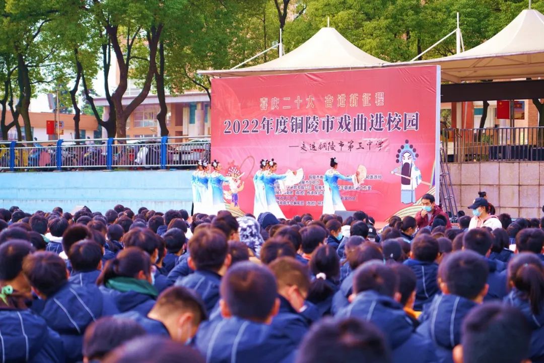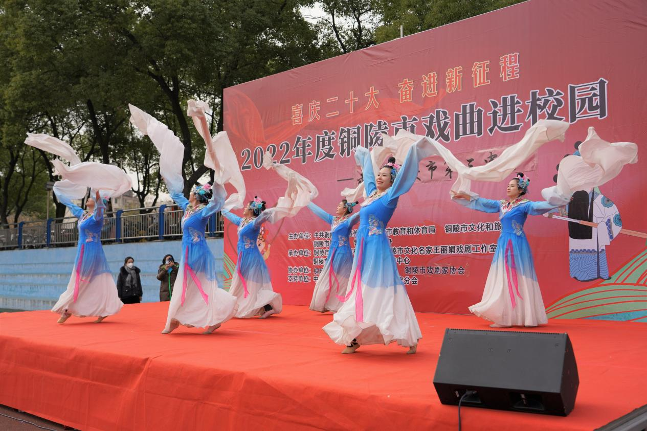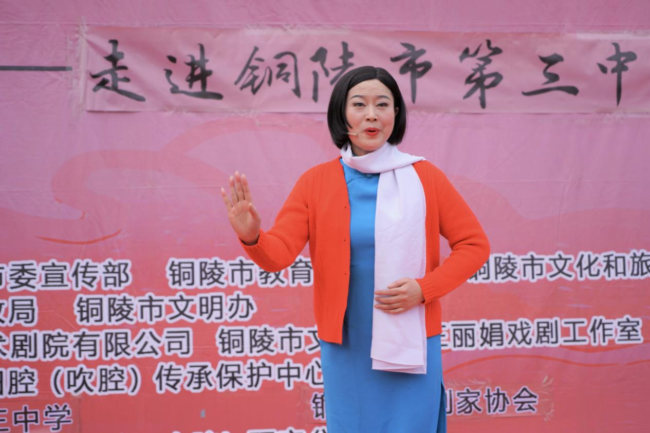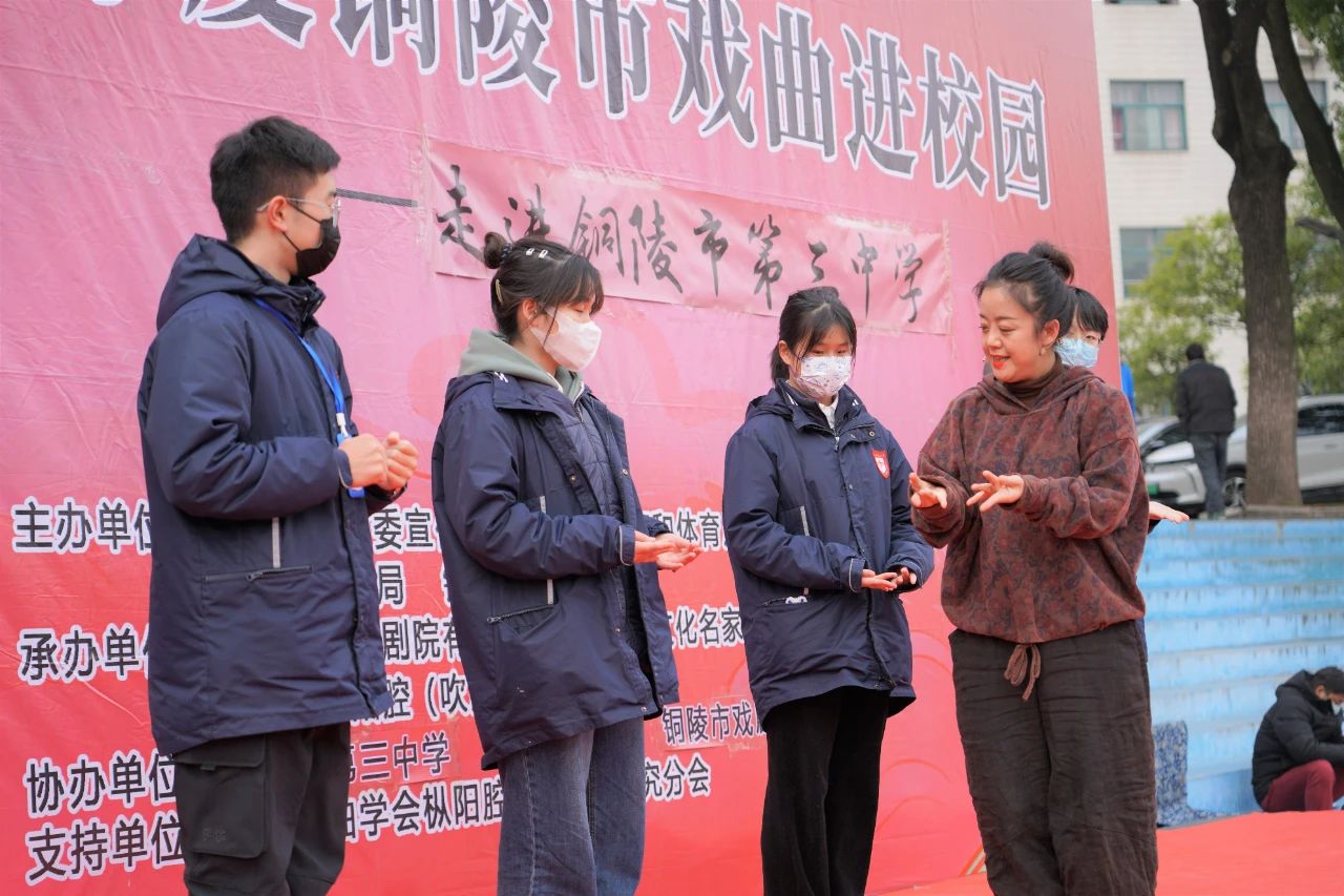 戏曲是中华文化的瑰宝,传承戏曲艺术关键在人,一代代戏曲人执着坚守、口传心授,创造了璀璨的中华戏曲文化,将这门古老的艺术薪火相传、源远流长。同学们,让我们一起弘扬中华优秀传统文化、传承戏曲艺术、创新校园文化、打造特色教育,书写铜陵文化教育事业的新篇章。