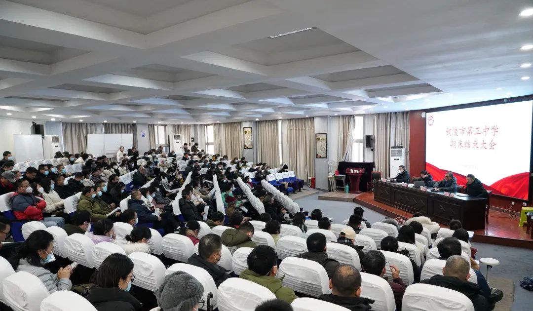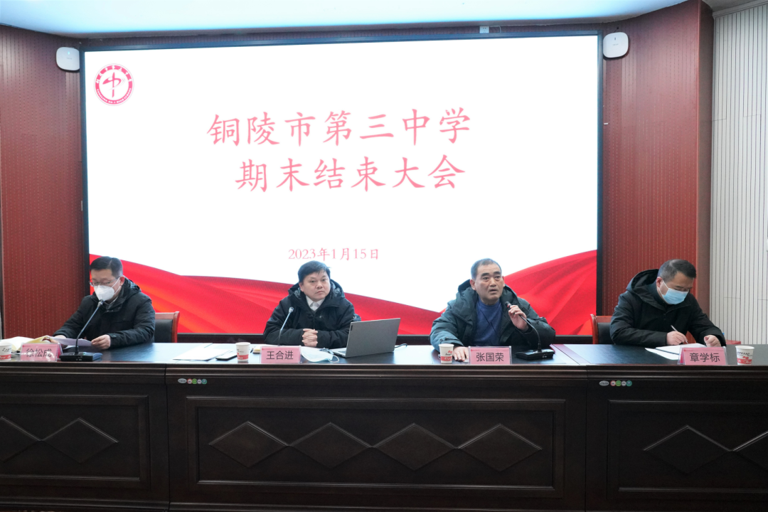 瑞雪降铜陵,祥瑞临三中。1月15日上午,铜陵三中期末结束大会在校多功能厅举行。校党委副书记、副校长王合进,校党委副书记张国荣,校党委委员、副校长徐松成,校党委委员、副校长章学标出席大会,全体教职员工参加大会,张国荣主持大会。