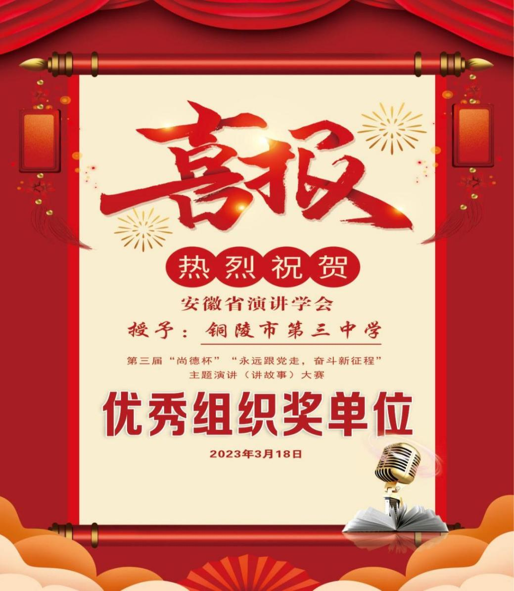 阳春三月,大地回春,值此朝气蓬勃之际,我校又迎来喜讯。铜陵市第三中学被安徽省演讲学会授予“优秀组织奖单位”称号。感谢安徽省演讲学会对我校演讲教育工作的高度肯定,感恩安徽省演讲学会对我校参赛选手的专业指导。我校一直重视爱国主义教育,旨在引导广大青少年学生牢固树立社会主义核心价值观,成为社会主义事业的建设者和接班人。