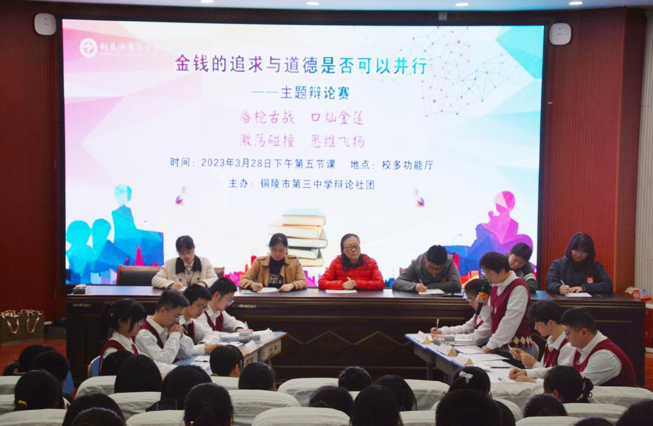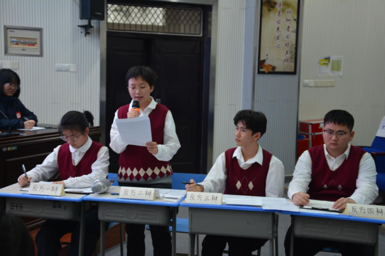 2023年3月28日下午活动课,我校第二届校园主题辩论赛在校多功能厅盛大举行。社团指导老师樊荣老师、徐云老师和曹玲玲老师担任教师评委,社长黄正宇、首届辩论赛优秀辩手安若熙、最受欢迎辩手湛子娴担任学生评委,刘颜宁同学担任主持人。