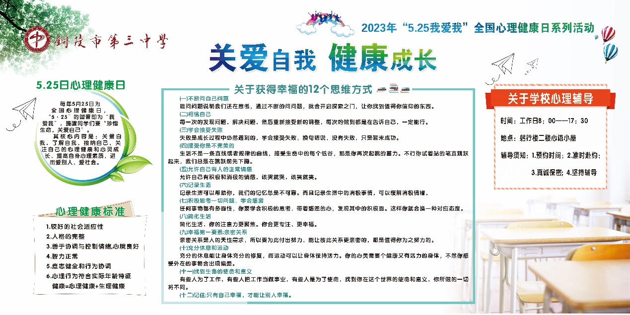 每年的5月25日是心理健康日,“5·25”的谐音为“我爱我”——爱“我”,即是以最大的真诚和勇气面对自我,以最恰当的方式接纳自我,以最适合的方式发展自我。2023年“5·25”心理健康周活动是希望能让同学们学会爱自己,以自洽的心态去生活,能爱自己的一切。愿同学们都能在自身中安居获得属于自己的终生浪漫。接下来就让我们一起走进心理健康周的活动吧。