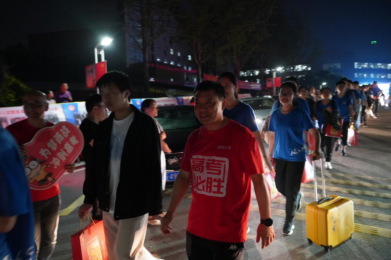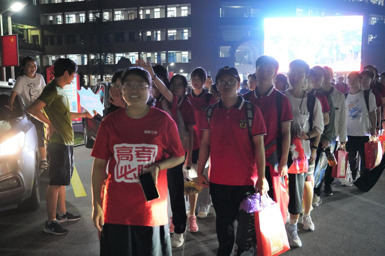 道路的两旁,三中的校领导驻足师生,微笑祝福;三中的老师和家长,手持祝福语,加油助力。切切目送和声声祝福,为学生们注入满腔的信心和成长的力量!