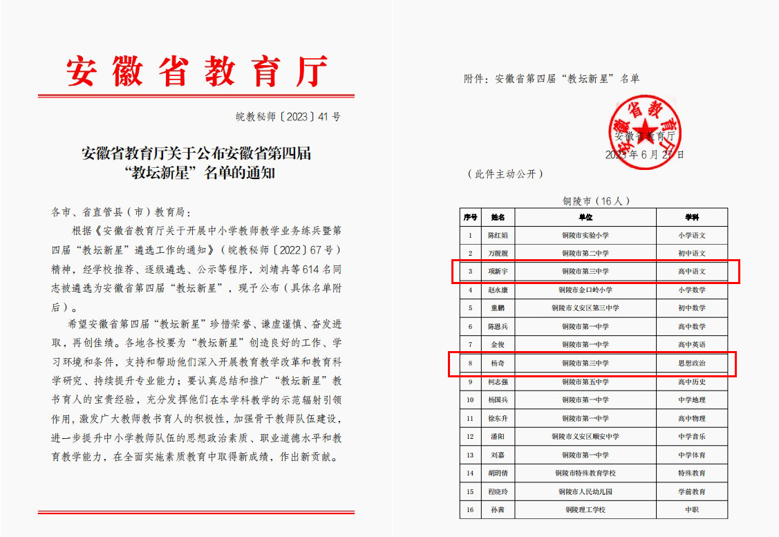 实锤了!铜陵三中再添一喜!热烈祝贺我校项新宇、杨奇两位老师荣获安徽省第四届“教坛新星”荣誉称号。