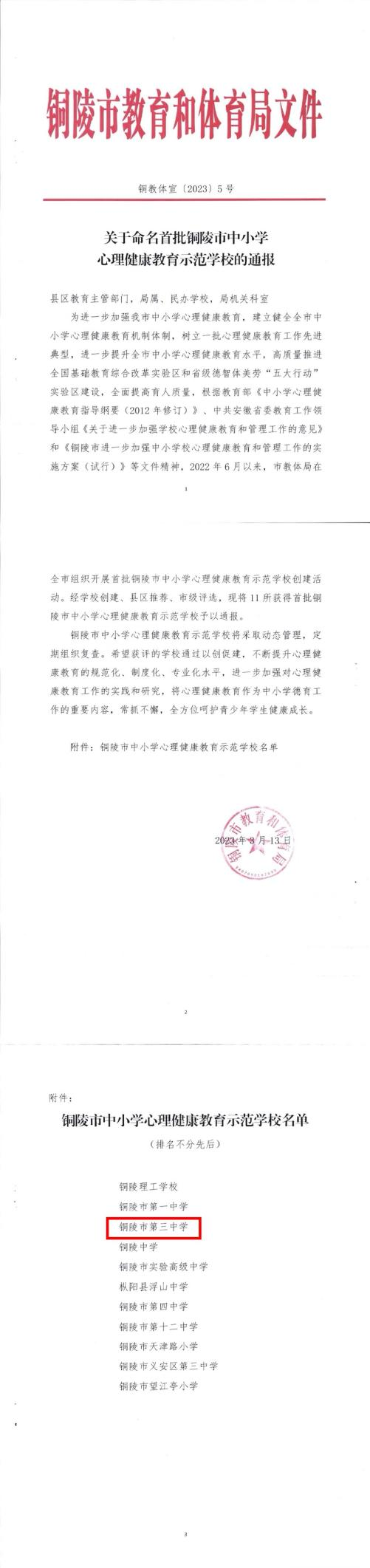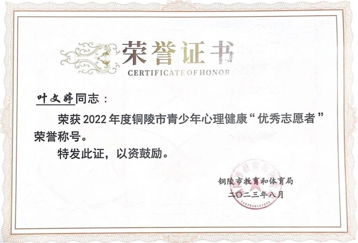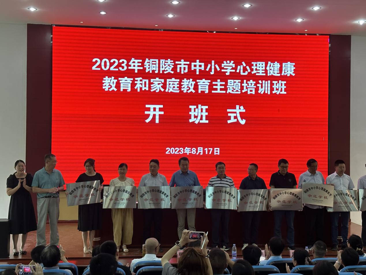 根据市教体局《关于命名首批铜陵市中小学心理健康教育示范校的通报》(铜教体宣〔2023〕5号)要求,经集体申报、综合调研、组织评审,共产生11所铜陵市心理健康教育示范校,我校位列其中。8月17日上午,首批铜陵市中小学心理健康教育示范学校授牌仪式在市十五中东校区隆重举行,我校获市教体局“铜陵市中小学心理健康教育示范学校”授牌。同时,我校专职心理健康教师叶文婷获得2022年度铜陵市青少年心理健康“优秀志愿者”荣誉称号。