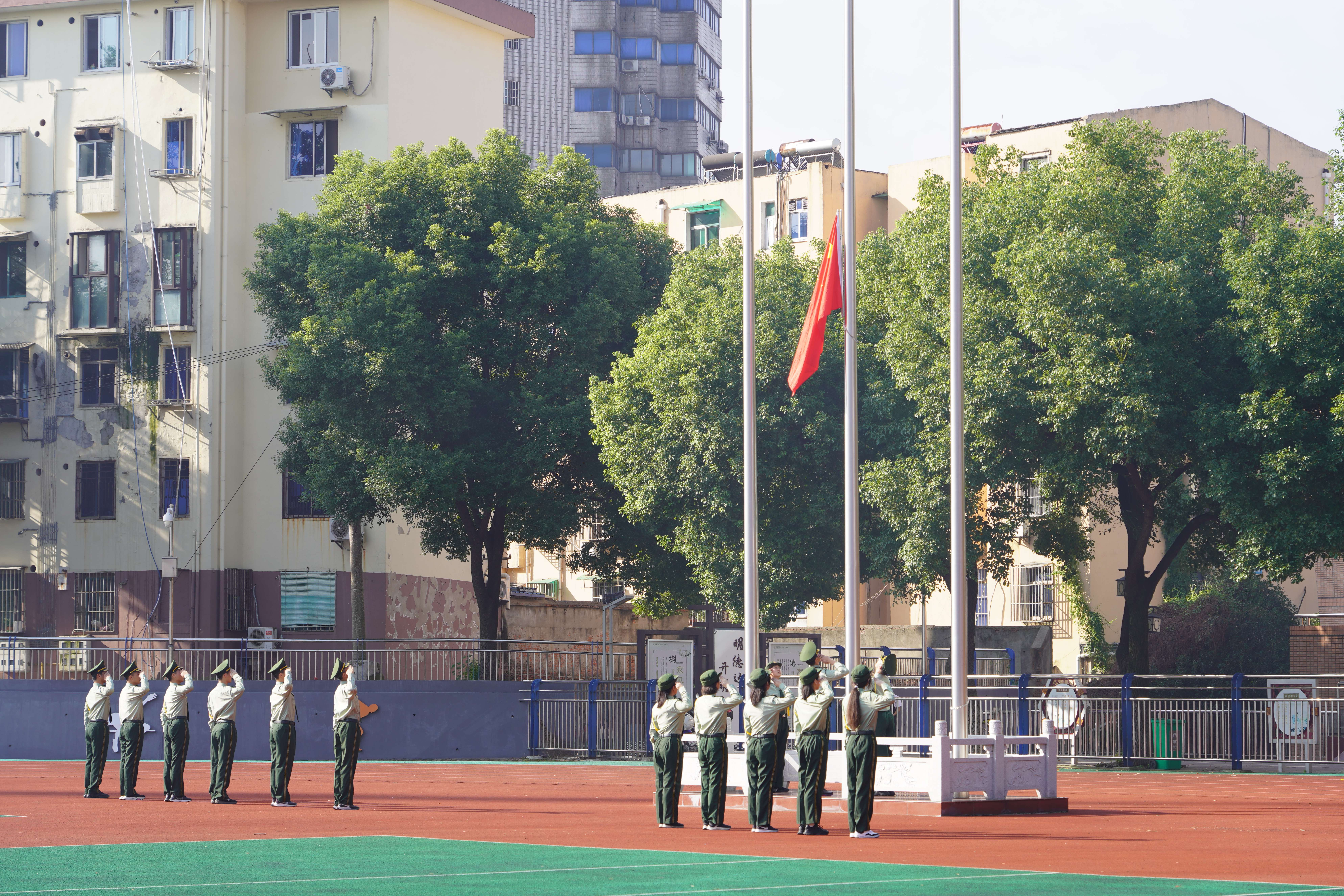 全体肃立注目,升国旗,奏国歌。国旗飘飘,国歌嘹亮。