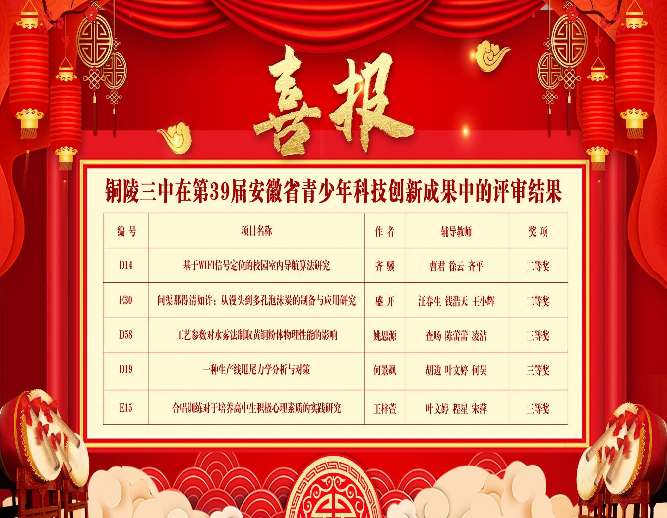 近日,第39届安徽省青少年科技创新大赛青少年科技创新成果评审揭晓。铜陵市第三中学《基于WIFI信号定位的校园室内导航算法研究》和《问渠那得清如许:从馒头到多孔泡沫炭的制备与应用研究》两个学生科技创新成果作品喜获省赛二等奖(铜陵市最高奖项);还有三个学生科技创新成果作品荣获省赛三等奖。