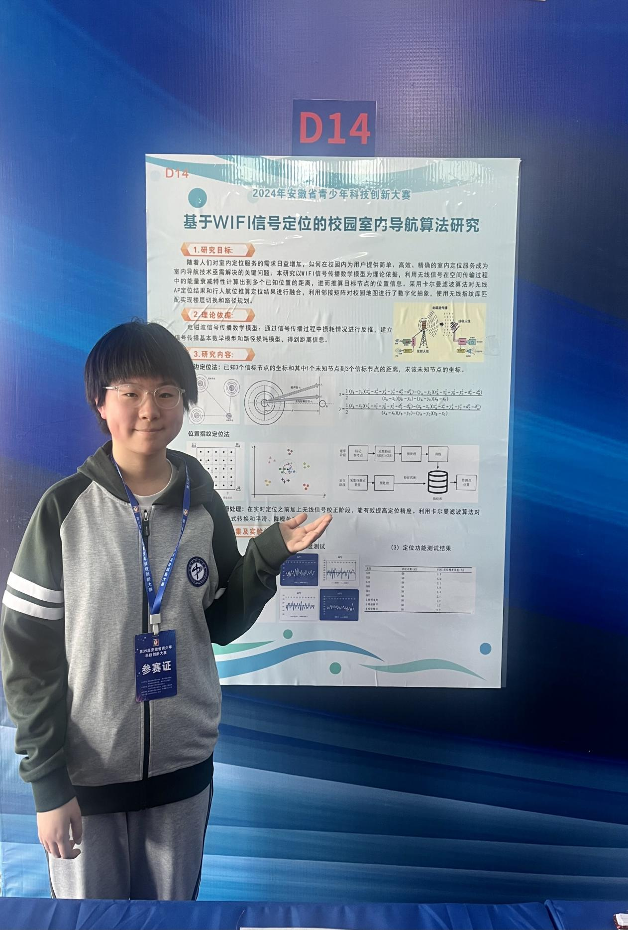 我校高一(18)班齐骥同学热爱科学,学以致用。生活中,她善于发现,勤于思考,不懂就问。鉴于在校园内,许多建筑物和设施可能比较复杂,特别是在大学校园中,建筑物的布局和结构可能更加多样化。所以,对于师生和访客来说,在校园内找到目的地可能是一项具有挑战性的任务。随着人们对室内定位服务的需求日益增加,如何在校园内为用户提供简单、高效、精确的室内定位服务成为室内导航技术亟需解决的关键问题。经过一年多的潜心研究,齐骥同学的项目《基于WIFI信号定位的校园室内导航算法研究》圆满结题,她以WIFI信号传播数学模型为理论依据,利用无线信号在空间传输过程中的能量衰减特性计算出到多个已知位置的AP节点距离,进而通过相应的定位方法推算目标节点的位置信息。