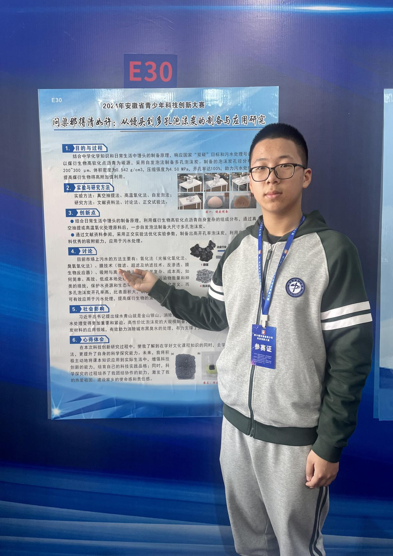 研究中,他发现:随着我国经济的快速发展,产生的污水越来越多,这样,开发高性价比的污水处理方法就具有重要的研究意义。于是,在老师和家长的带领下,他利用寒假时间,翻阅大量书籍,上网求证科学的方法,扎实开展科研活动。在日常制备馒头工艺的基础上,以煤衍生物高软化点沥青为碳源,采用自发泡法制备多孔泡沫炭。研究发现:制备的泡沫炭孔径分布在200~300 μm、体积密度为0.542 g/cm3,压缩强度为4.50 MPa,开孔率达100%,对生活污水具有显著的净化效果。他的科学研究论文结合了馒头的制备原理,以煤衍生物高软化点沥青为原料,采用自发泡法,制备多孔炭材料,利用多孔炭材料优秀的吸附能力,助力污水处理,提高煤衍生物得高附加值利用。