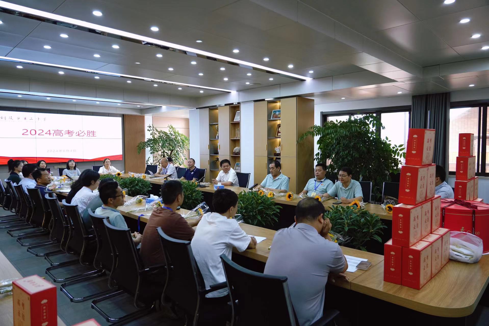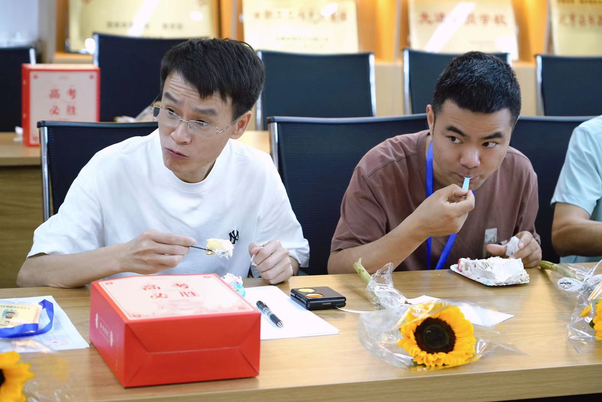 现场洋溢着温馨而热烈的气氛,蛋糕的甜蜜似乎预示着学生们即将到来的成功,而向日葵则象征着他们面向阳光、勇往直前的精神。这些细节背后,是学校对学生们深深的关怀和对他们未来的美好祝愿,整个会场被温暖和正能量所包围。