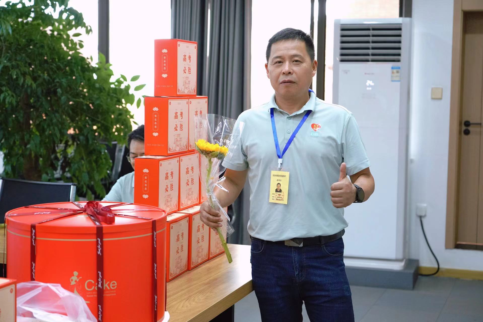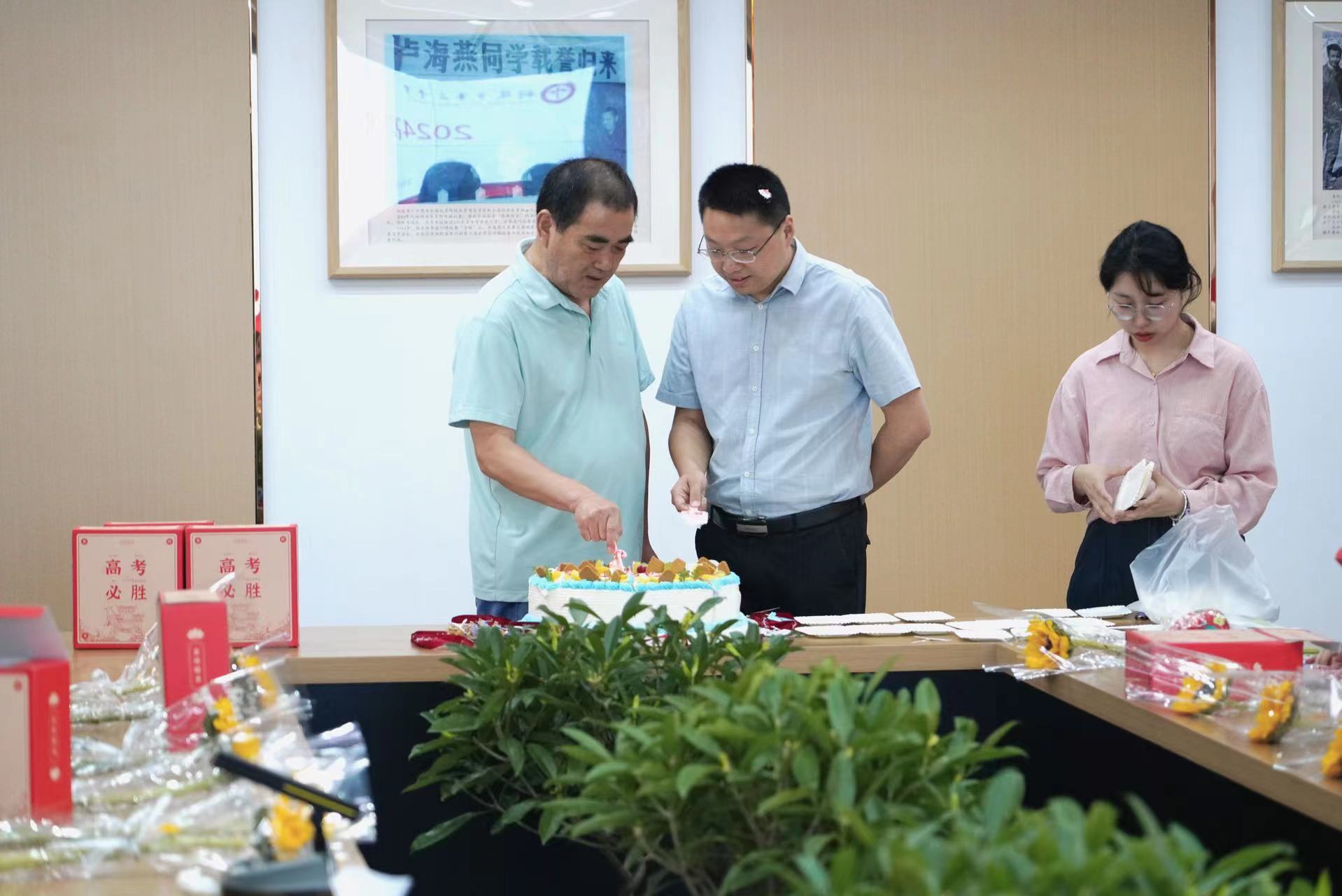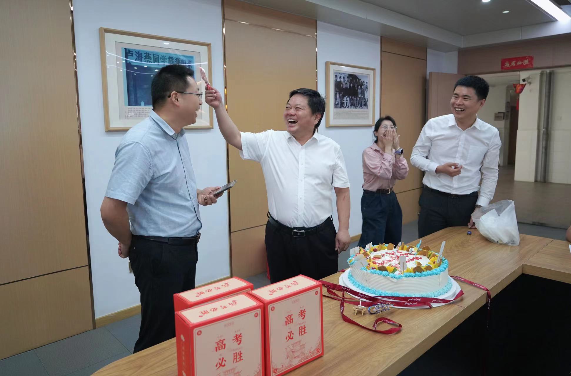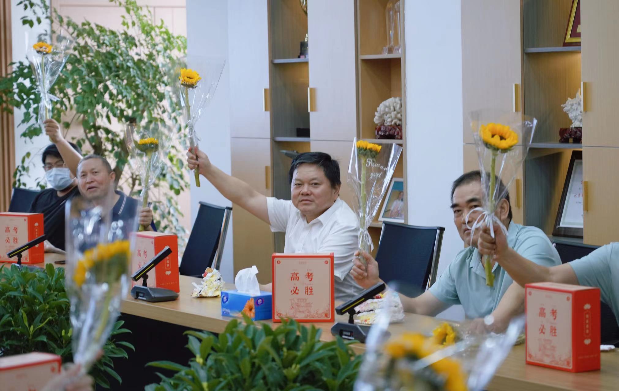 6月4日上午8点30分,校党委副书记、副校长王合进,党委副书记张国荣为即将把学子们送入高考考场的高三班主任们切下象征胜利与甜蜜的蛋糕,并向每位班主任送上了寓意阳光和希望的向日葵花束,以及满满的祝福。